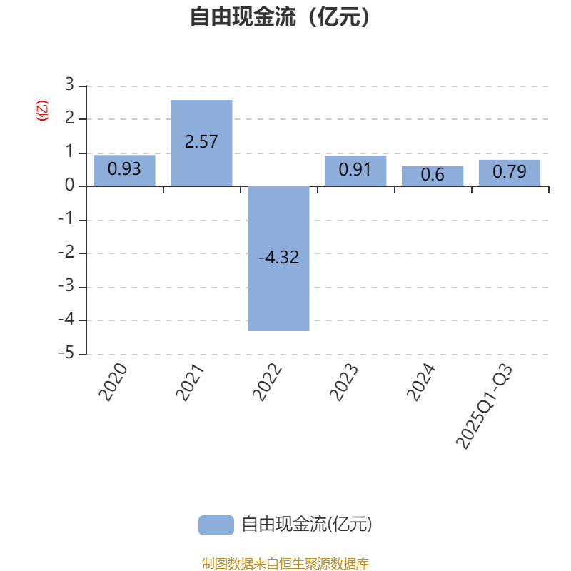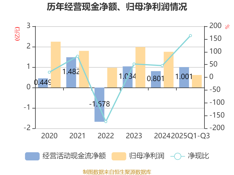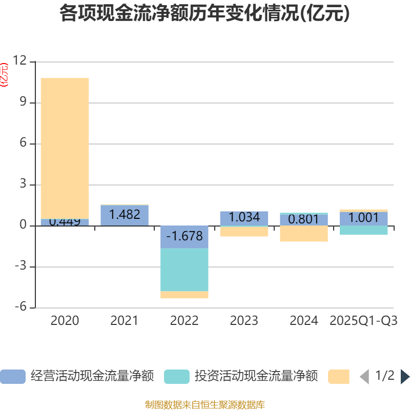 2025年前三季度,公司经营活动现金流净额为1亿元,同比增加2.29亿元;筹资活动现金流净额1712.15万元,同比增加1.33亿元;投资活动现金流净额-6759.06万元,上年同期为-1303.26万元。