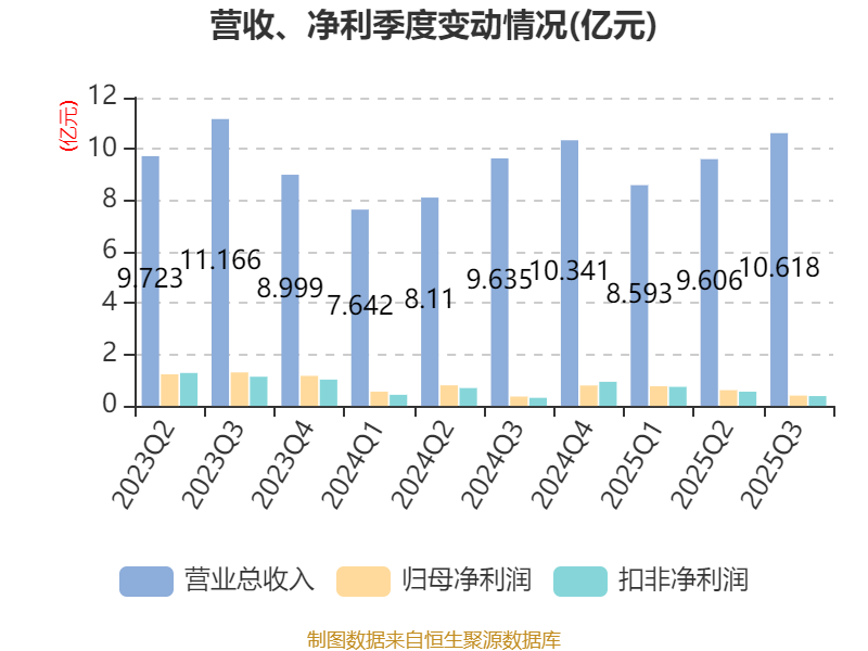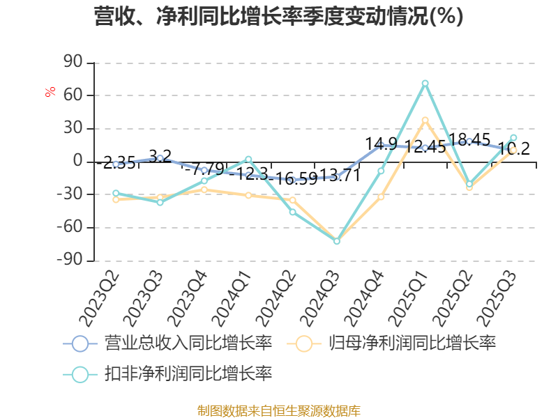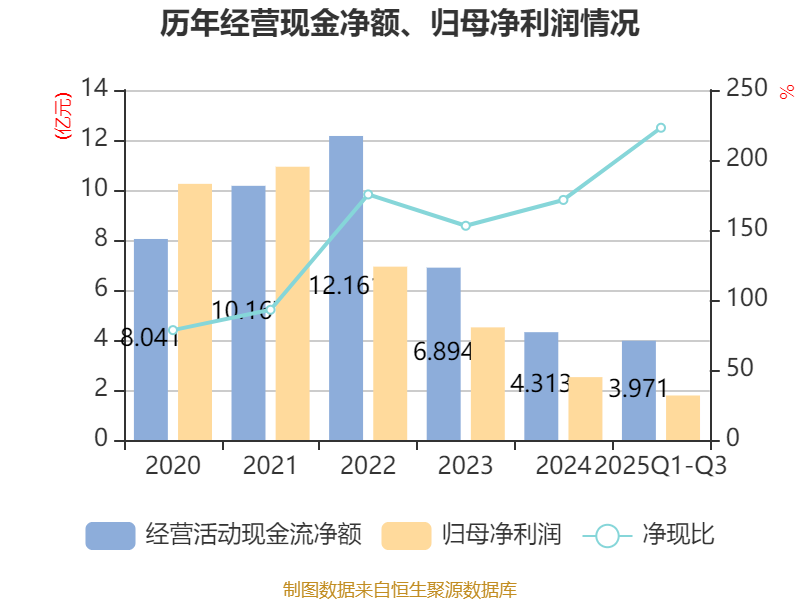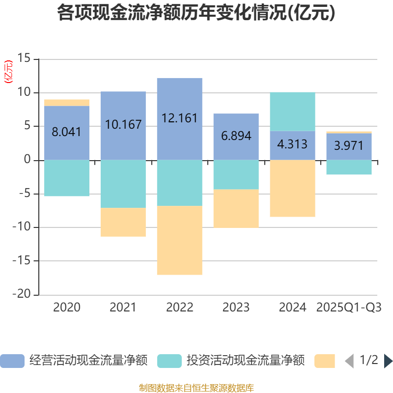 2025年前三季度,公司经营活动现金流净额为3.97亿元,同比增长20.11%;筹资活动现金流净额2661.28万元,同比增加6.22亿元;投资活动现金流净额-2.15亿元,上年同期为7.68亿元。