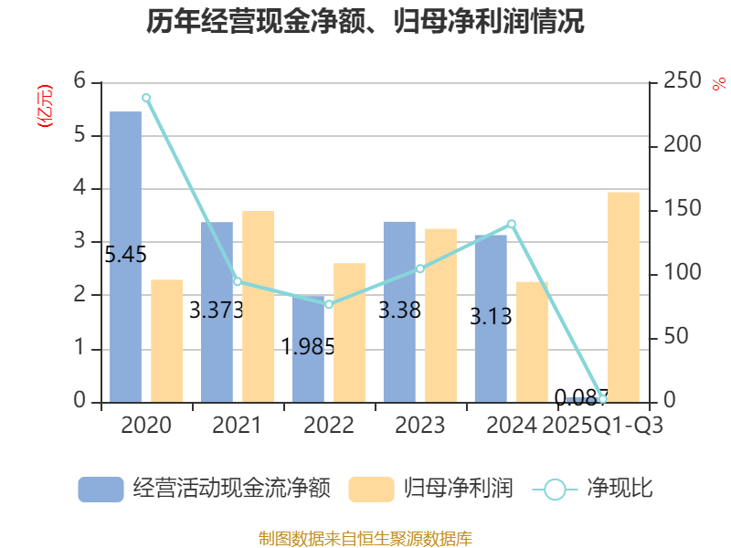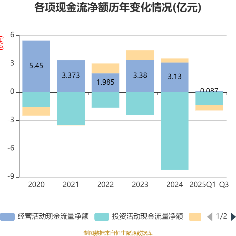 2025年前三季度,公司经营活动现金流净额为872.57万元,同比下降95.52%;筹资活动现金流净额-5969.18万元,同比减少1531.07万元;投资活动现金流净额-1.35亿元,上年同期为-7.39亿元。