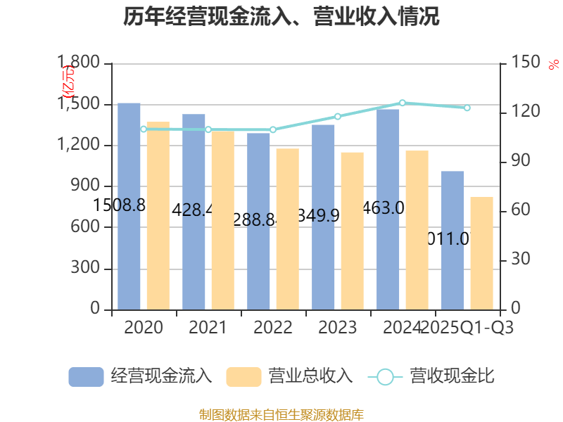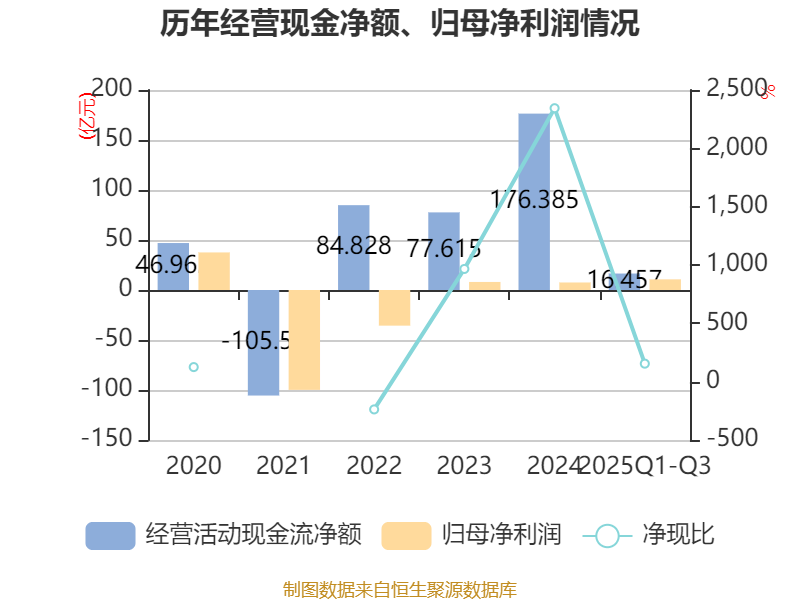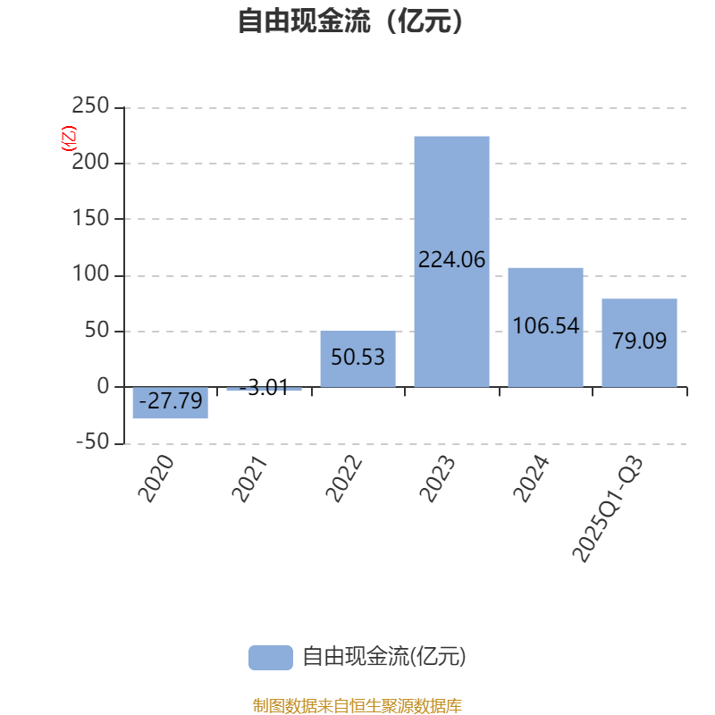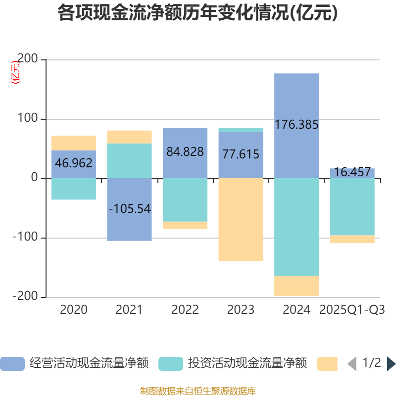 2025年前三季度,公司经营活动现金流净额为16.46亿元,同比增长6637.37%;筹资活动现金流净额-12.85亿元,同比减少8.67亿元;投资活动现金流净额-96.29亿元,上年同期为3.22亿元。