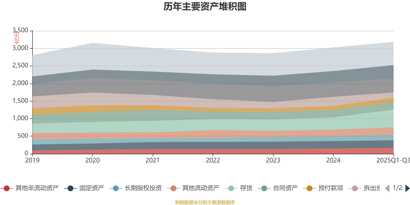 资产重大变化方面,截至2025年三季度末,公司存货较上年末增加46.13%,占公司总资产比重上升4.43个百分点;拆出资金较上年末减少44.18%,占公司总资产比重下降4.07个百分点;货币资金较上年末增加17.54%,占公司总资产比重上升1.25个百分点;应收票据及应收账款较上年末减少2.32%,占公司总资产比重下降0.97个百分点。