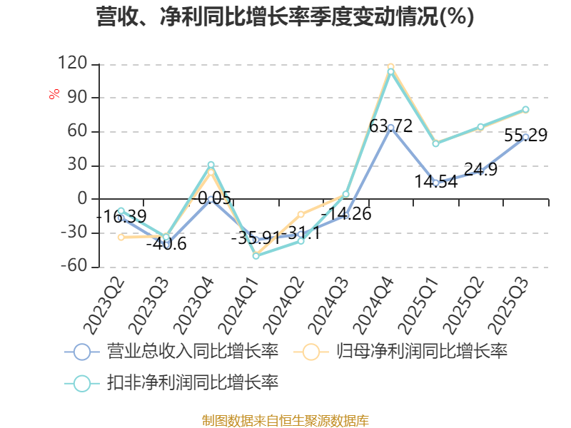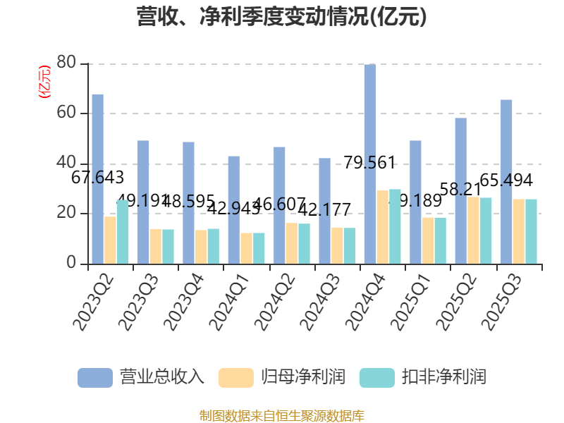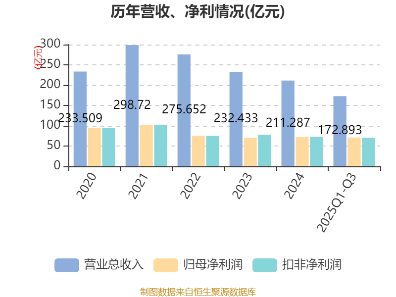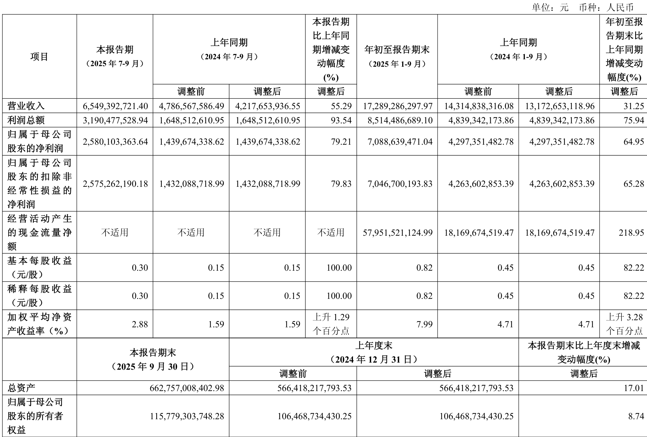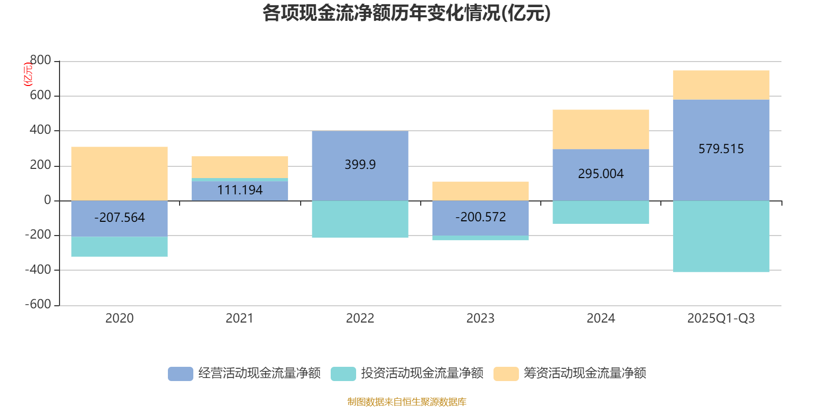2025年前三季度,公司经营活动现金流净额为579.52亿元,同比增长218.95%;筹资活动现金流净额166.88亿元,同比增加197.69亿元;投资活动现金流净额-409.64亿元,上年同期为20.64亿元。