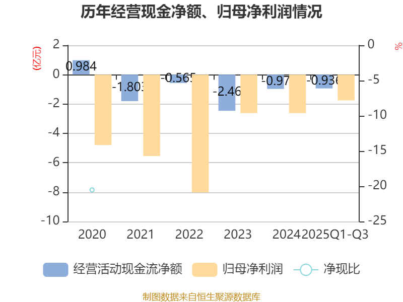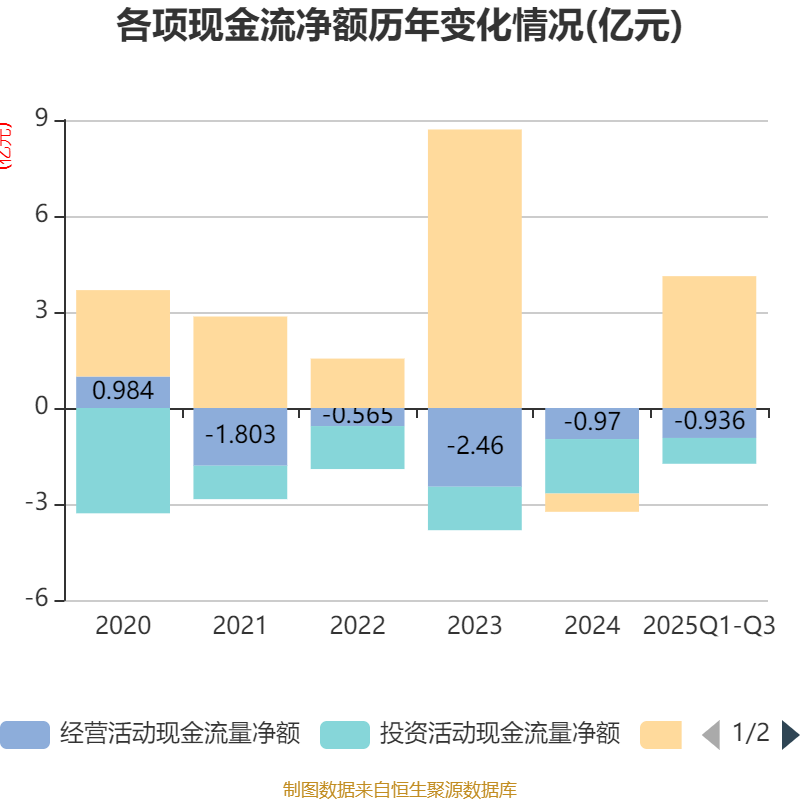 2025年前三季度,公司经营活动现金流净额为-9360.61万元,同比减少1.85亿元;筹资活动现金流净额4.12亿元,同比增加8.27亿元;投资活动现金流净额-8073.44万元,上年同期为-8896.08万元。