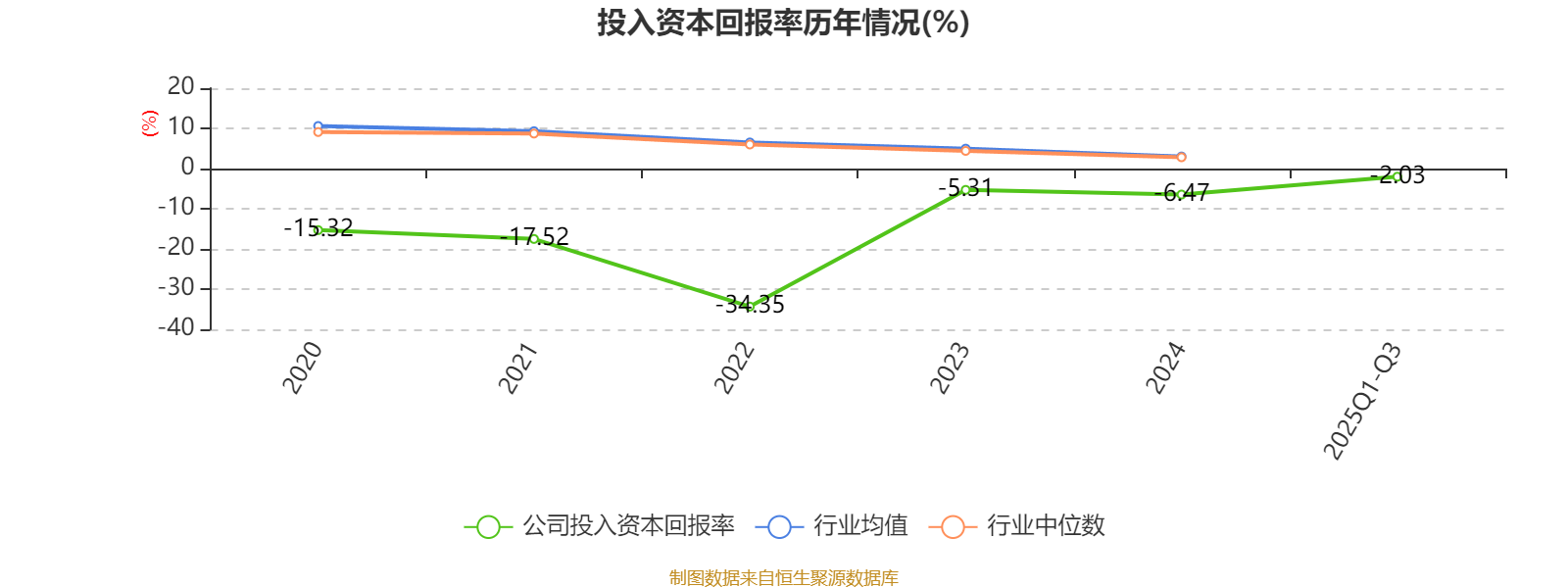 公司2025年前三季度投入资本回报率为-2.03%,较上年同期上升3.03个百分点。