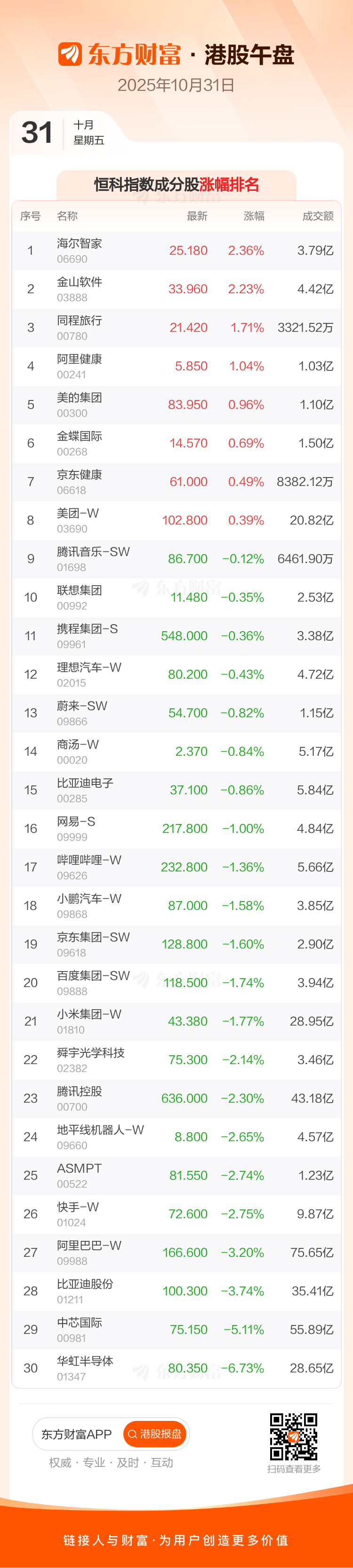 10月31日港股午盘:恒指跌0.89% 中芯国际领跌成分股