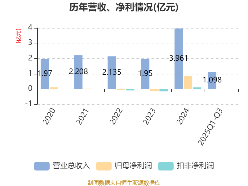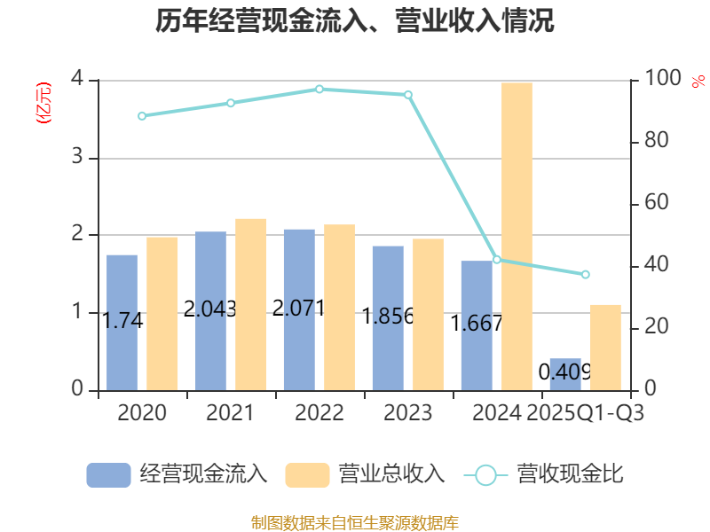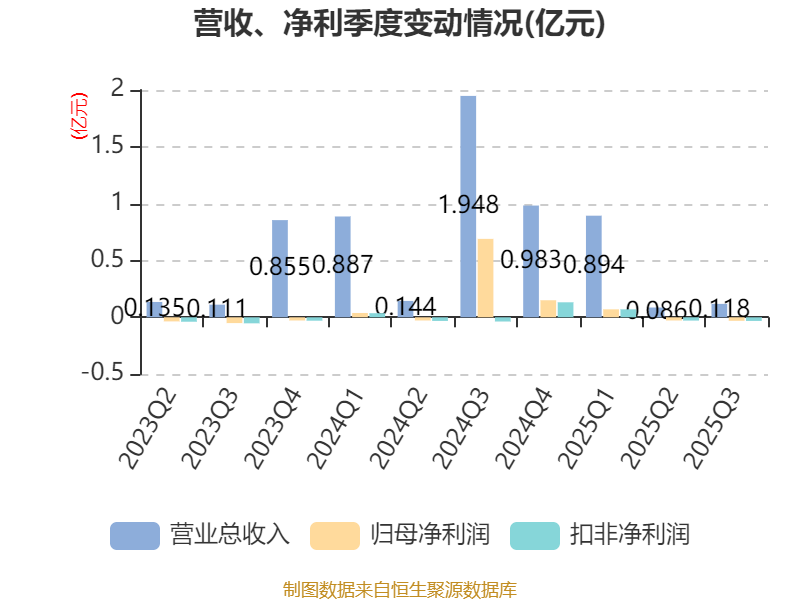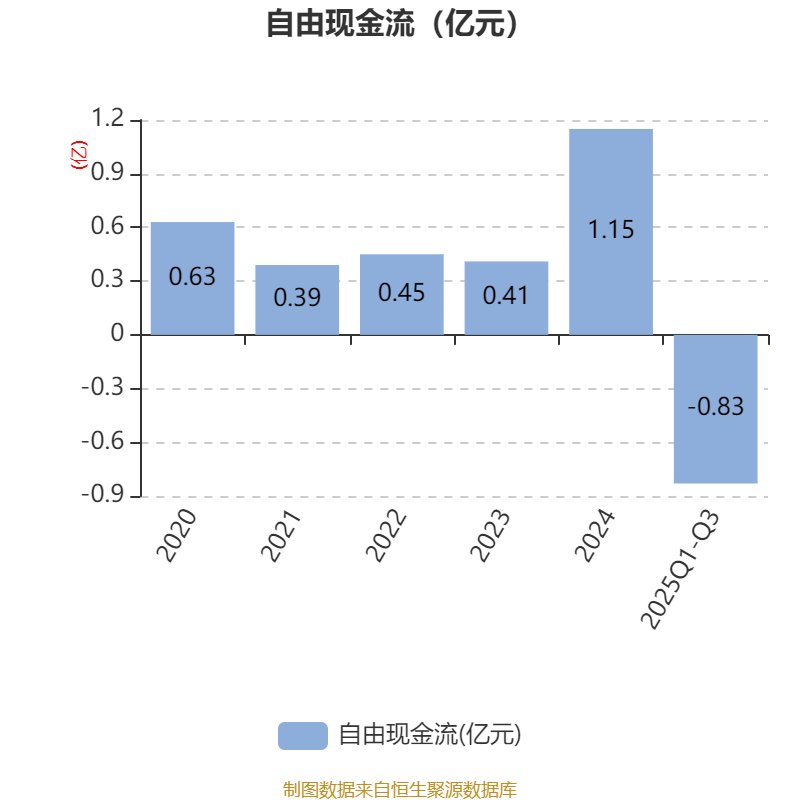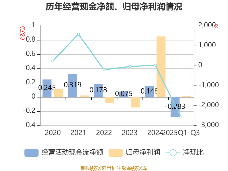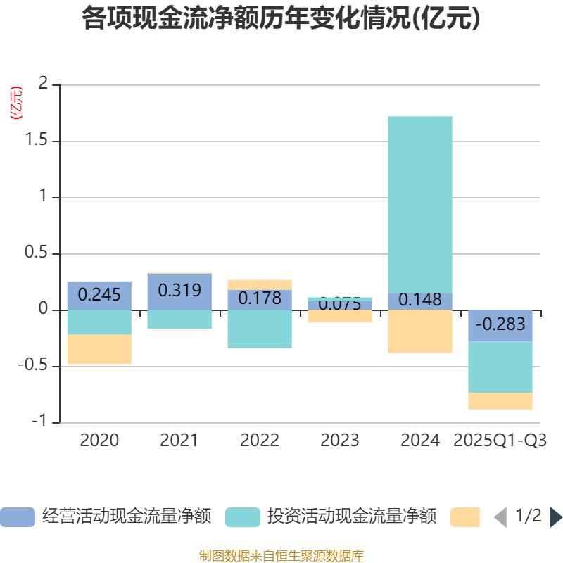 2025年前三季度,公司经营活动现金流净额为-2832.06万元,同比增加4898.97万元;筹资活动现金流净额-1468.2万元,同比增加2599.62万元;投资活动现金流净额-4568.77万元,上年同期为1.72亿元。