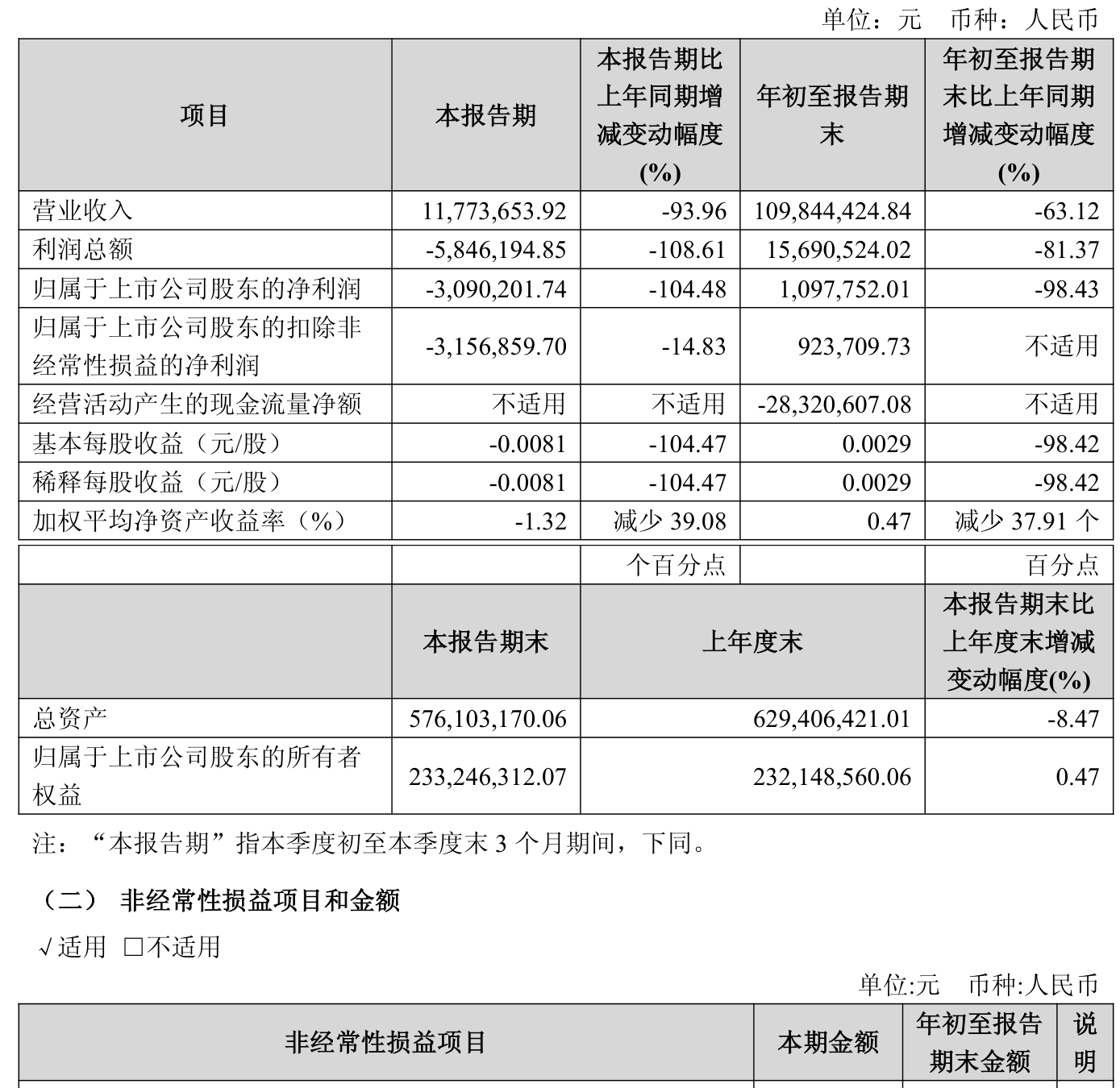 中证智能财讯廊坊发展(600149)10月31日披露2025年第三季度报告。前三季度公司实现营业总收入1.1亿元,同比下降63.12%;归母净利润109.78万元,同比下降98.43%;扣非净利润92.37万元,同比扭亏;经营活动产生的现金流量净额为-2832.06万元,上年同期为-7731.04万元;报告期内,廊坊发展基本每股收益为0.0029元,加权平均净资产收益率为0.47%。