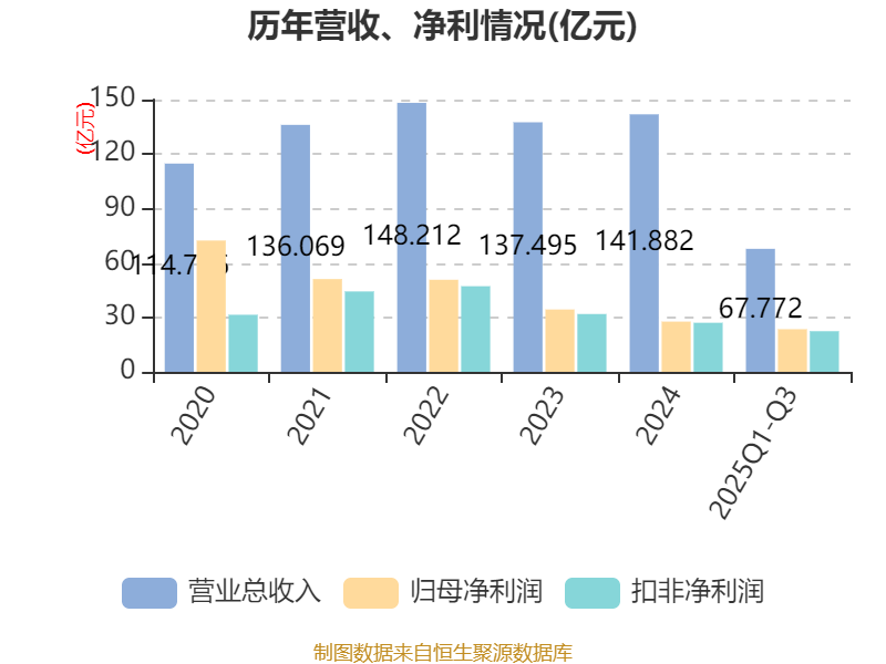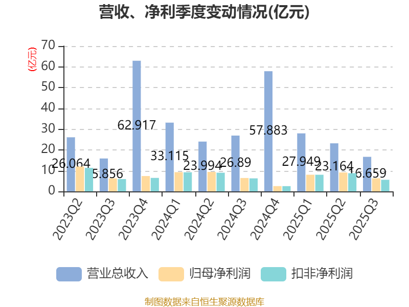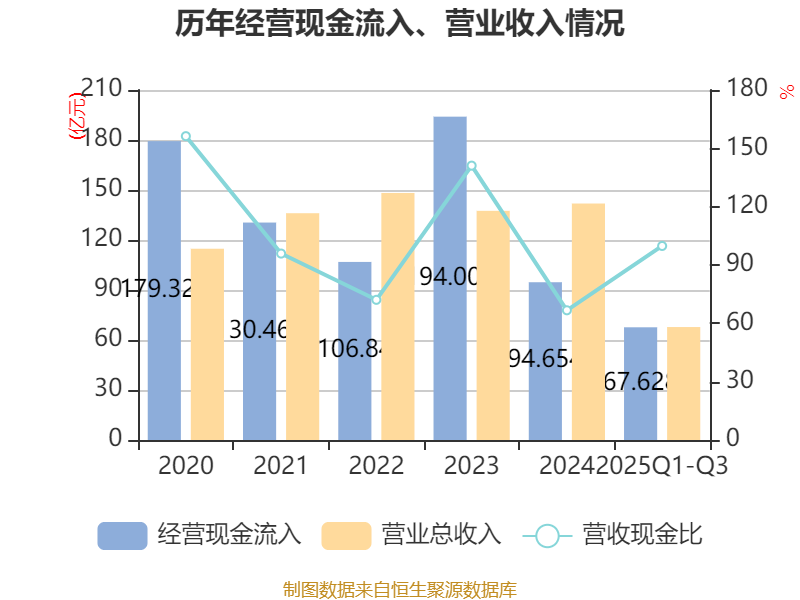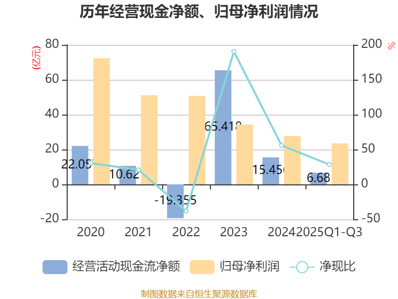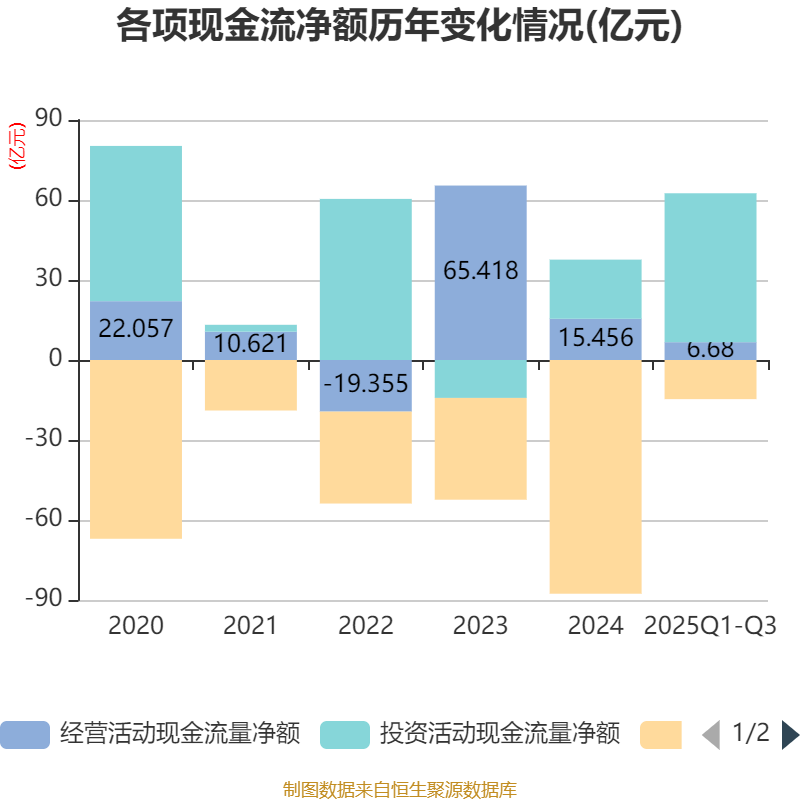2025年前三季度,公司经营活动现金流净额为6.68亿元,同比下降4.18%;筹资活动现金流净额-14.67亿元,同比增加61.09亿元;投资活动现金流净额55.84亿元,上年同期为21.14亿元。