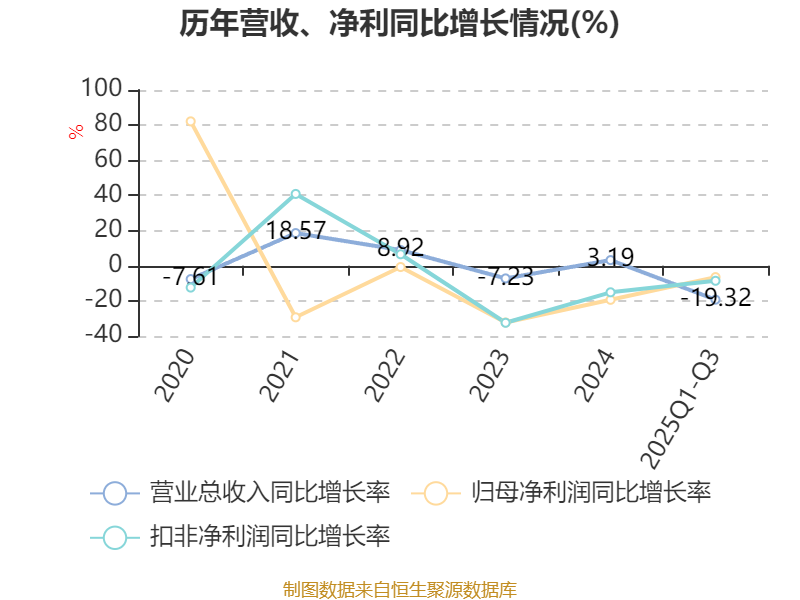 中证智能财讯雅戈尔(600177)10月31日披露2025年第三季度报告。前三季度公司实现营业总收入67.77亿元,同比下降19.32%;归母净利润23.49亿元,同比下降6.48%;扣非净利润22.39亿元,同比下降8.58%;经营活动产生的现金流量净额为6.68亿元,同比下降4.18%;报告期内,雅戈尔基本每股收益为0.51元,加权平均净资产收益率为5.58%。