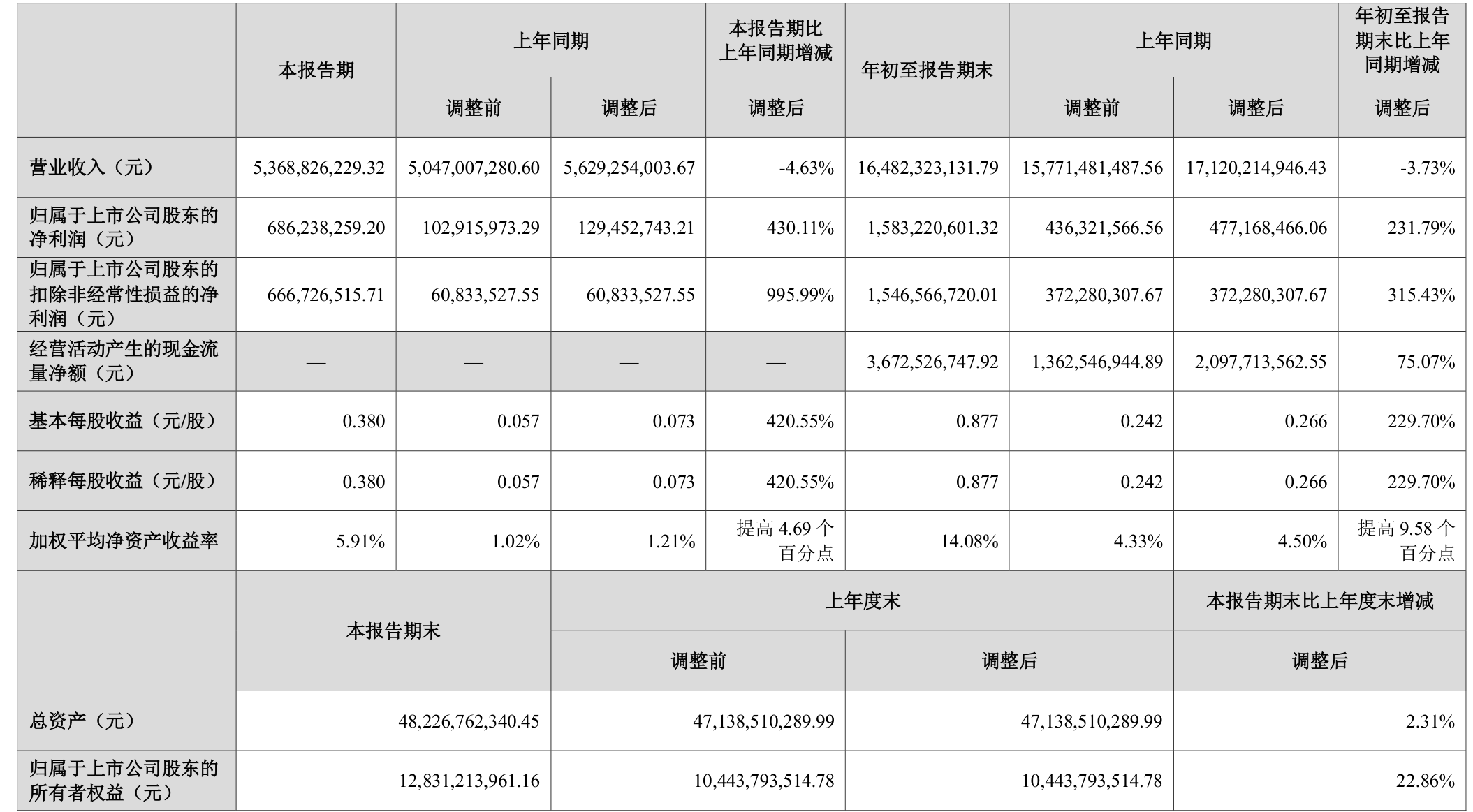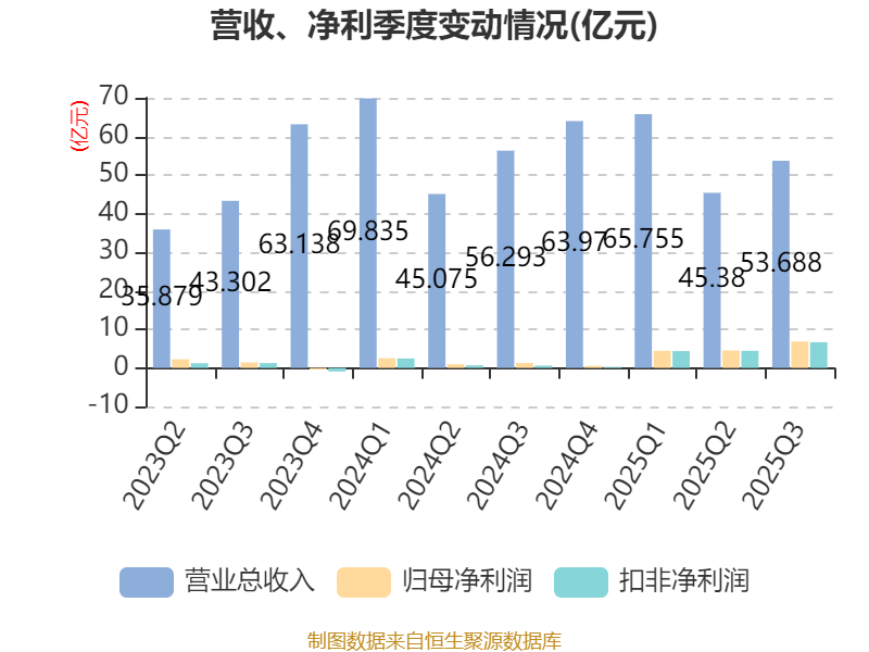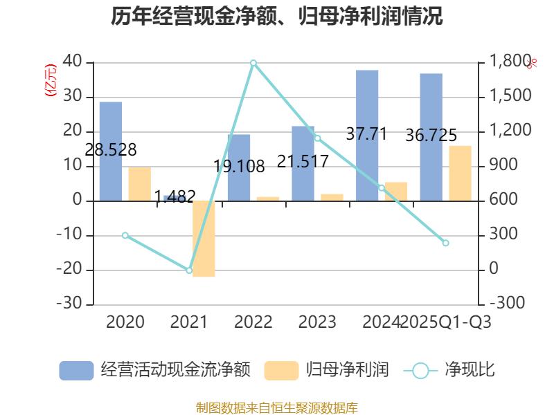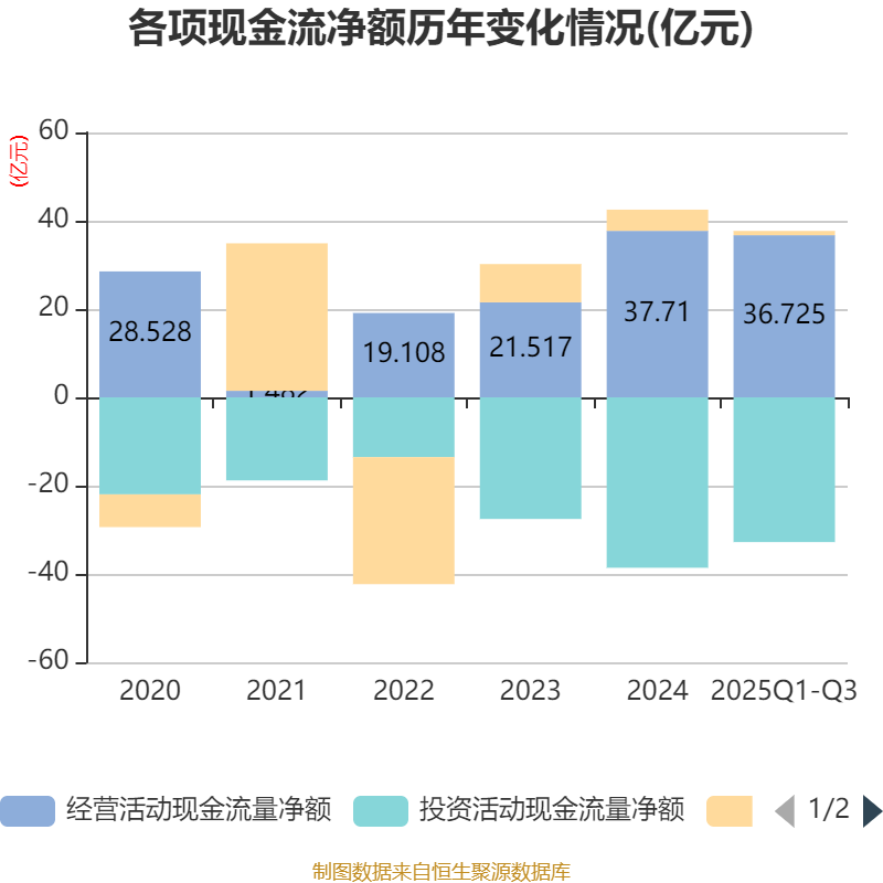 2025年前三季度,公司经营活动现金流净额为36.73亿元,同比增长75.07%;筹资活动现金流净额9692.28万元,同比增加2.46亿元;投资活动现金流净额-32.79亿元,上年同期为-17.92亿元。