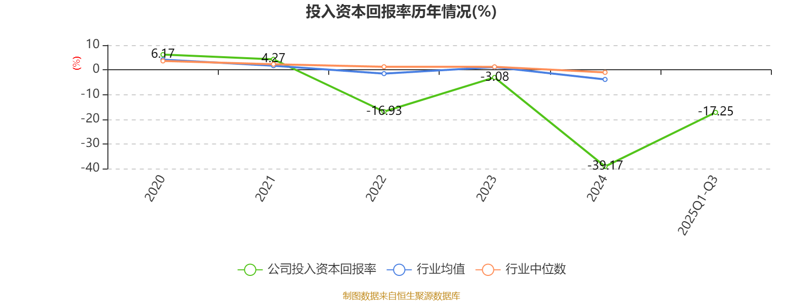 公司2025年前三季度投入资本回报率为-17.25%,较上年同期下降14个百分点。