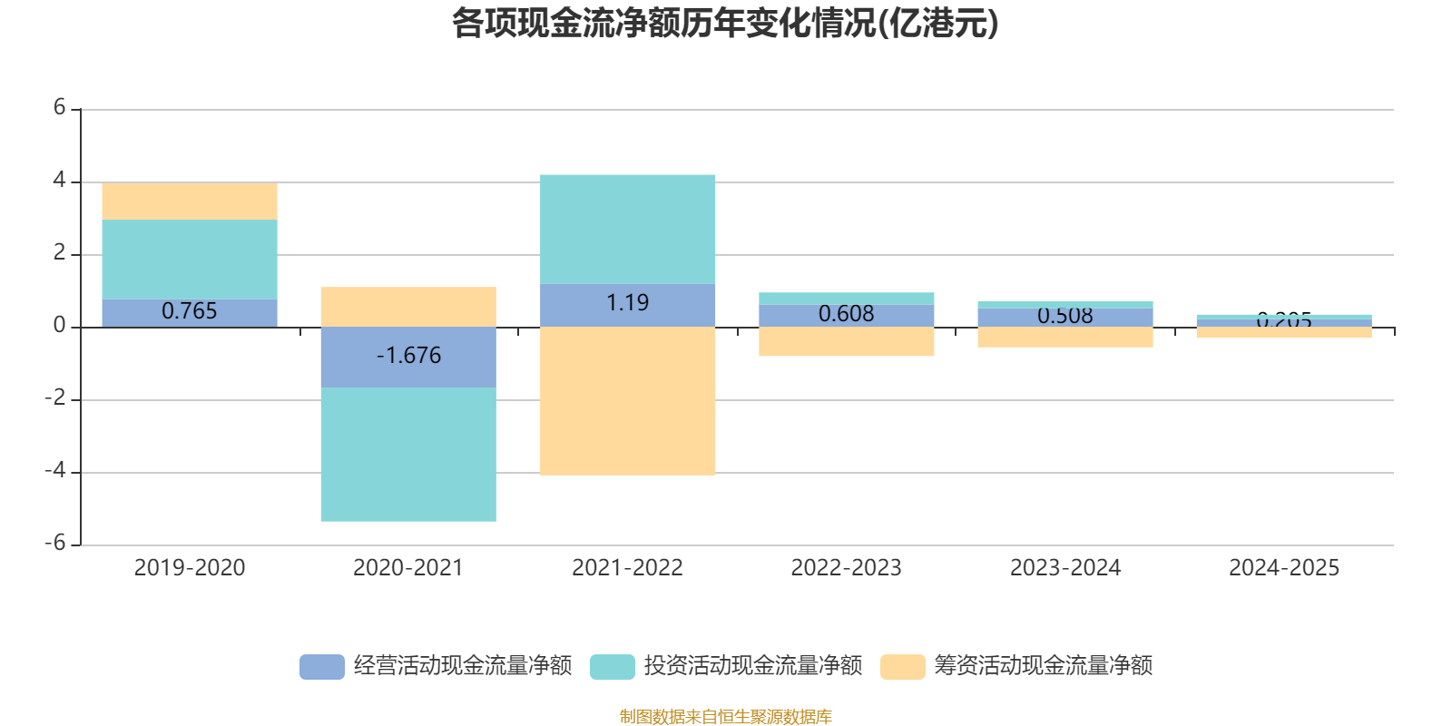 报告期内,公司经营活动现金流净额为2048.6万港元,同比下降59.64%;筹资活动现金流净额-3033.2万港元,同比增加2657.1万港元;投资活动现金流净额1249.7万港元,上年同期为1936.7万港元。