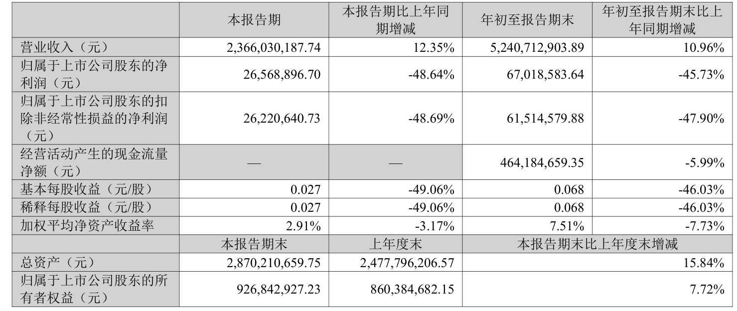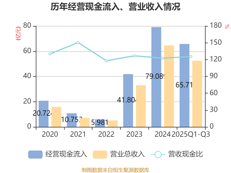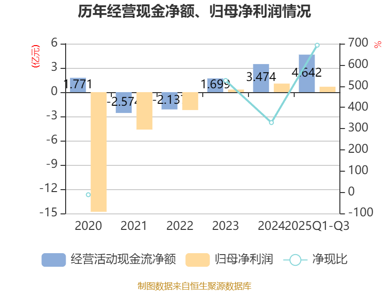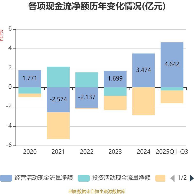 2025年前三季度,公司经营活动现金流净额为4.64亿元,同比下降5.99%;筹资活动现金流净额-1.32亿元,同比增加1.03亿元;投资活动现金流净额-3267.02万元,上年同期为1214.32万元。