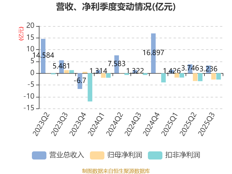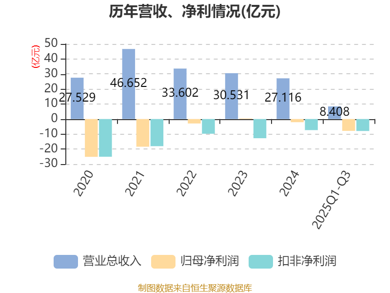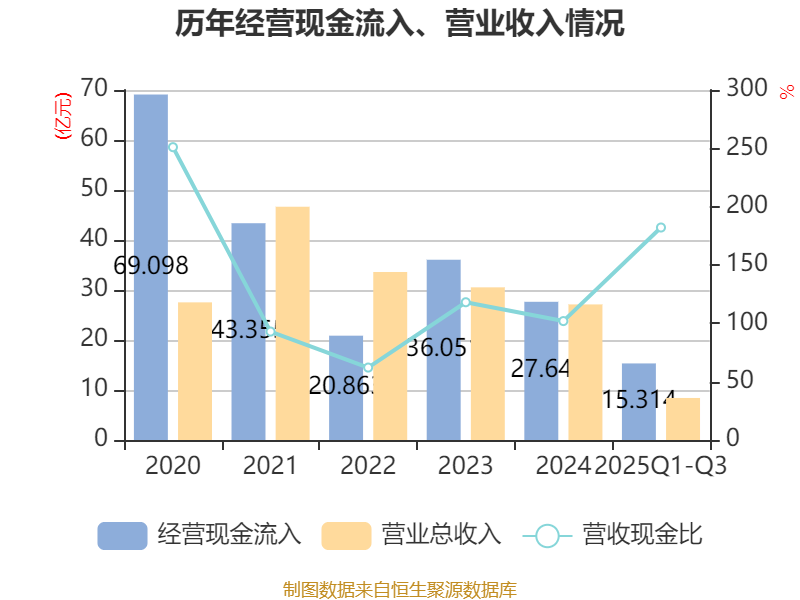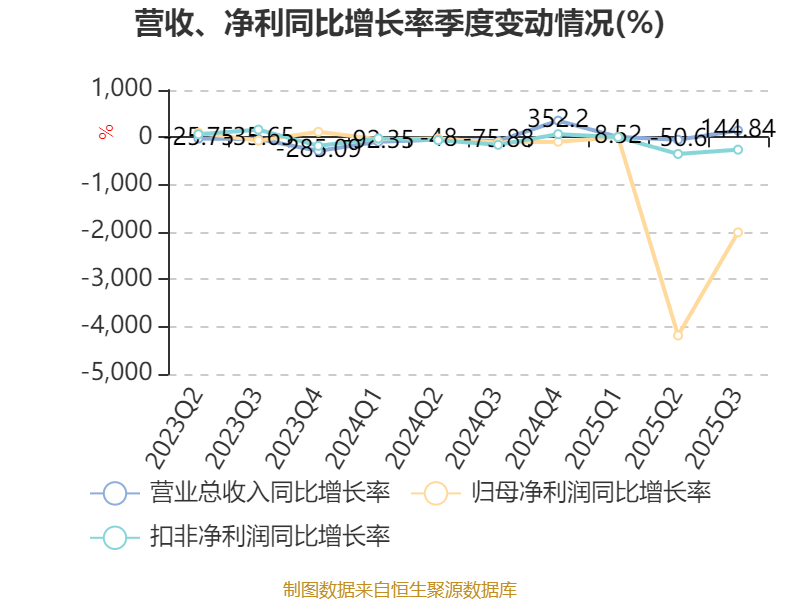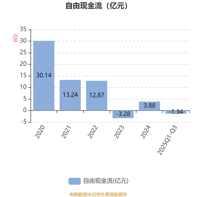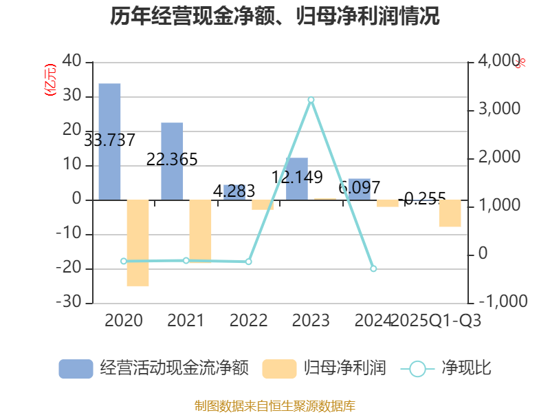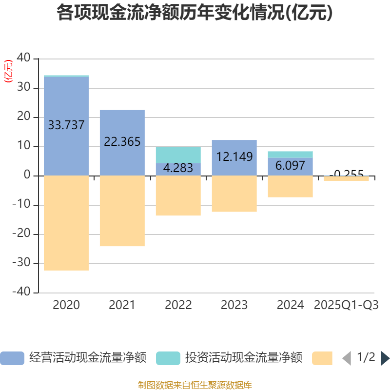 2025年前三季度,公司经营活动现金流净额为-2548.89万元,同比增加4.24亿元;筹资活动现金流净额-1.58亿元,同比减少5.6亿元;投资活动现金流净额285.39万元,上年同期为-1651.92万元。