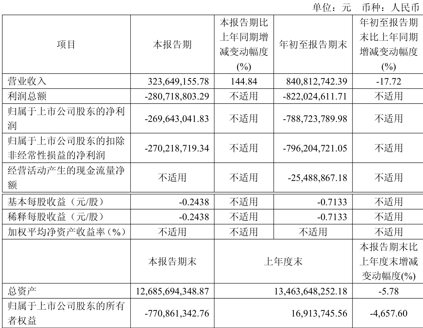 中证智能财讯津投城开(600322)10月31日披露2025年第三季度报告。前三季度公司实现营业总收入8.41亿元,同比下降17.72%;归母净利润亏损7.89亿元,上年同期亏损2.15亿元;扣非净利润亏损7.96亿元,上年同期亏损3.44亿元;经营活动产生的现金流量净额为-2548.89万元,上年同期为-4.49亿元;报告期内,津投城开基本每股收益为-0.7133元。