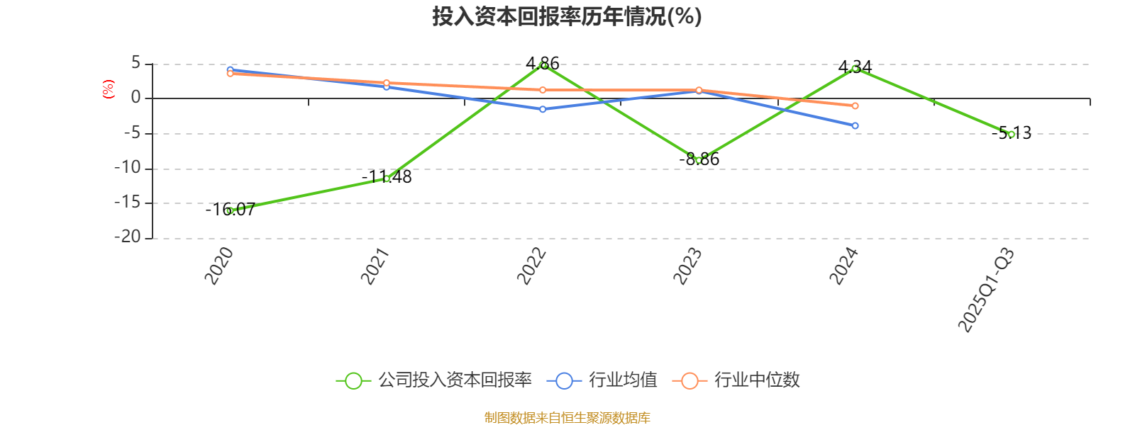 公司2025年前三季度投入资本回报率为-5.13%,较上年同期下降7.48个百分点。