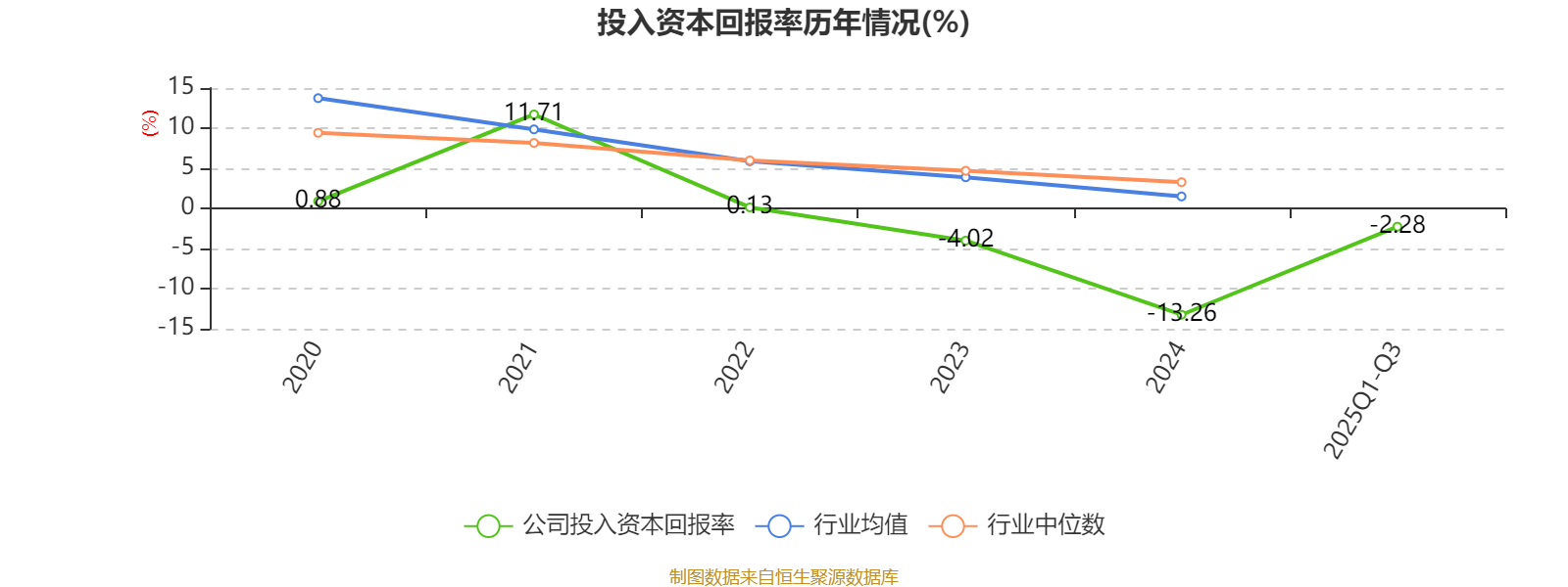 公司2025年前三季度投入资本回报率为-2.28%,较上年同期上升0.89个百分点。