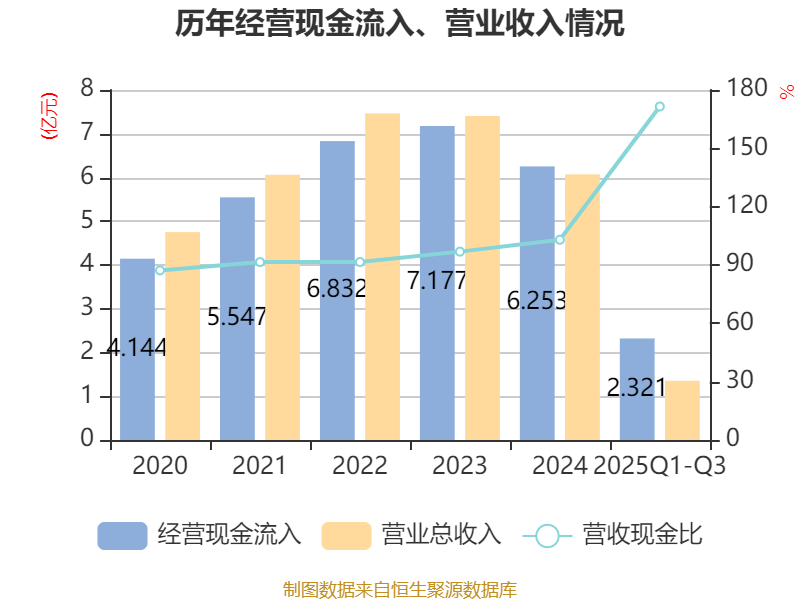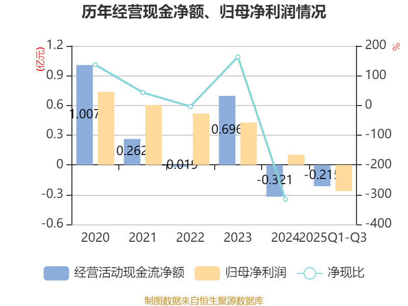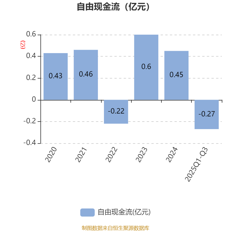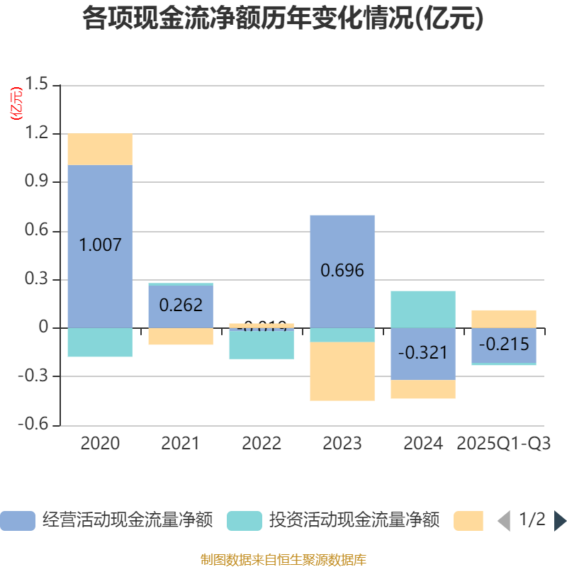 2025年前三季度,公司经营活动现金流净额为-2147.03万元,同比增加7275.04万元;筹资活动现金流净额1093.82万元,同比增加1179.35万元;投资活动现金流净额-137.97万元,上年同期为-106.4万元。