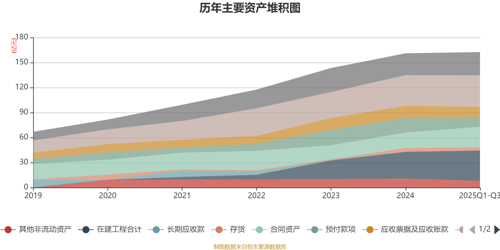 资产重大变化方面,截至2025年三季度末,公司预付款项较上年末减少36.59%,占公司总资产比重下降4.06个百分点;合同资产较上年末增加31.89%,占公司总资产比重上升3.56个百分点;在建工程合计较上年末增加13.63%,占公司总资产比重上升2.5个百分点;其他非流动资产较上年末减少26.35%,占公司总资产比重下降1.81个百分点。