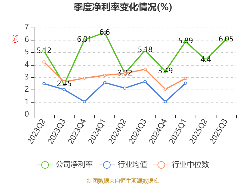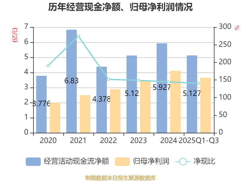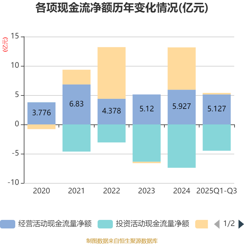 2025年前三季度,公司经营活动现金流净额为5.13亿元,同比下降12.2%;筹资活动现金流净额2544.76万元,同比减少6.1亿元;投资活动现金流净额-4.49亿元,上年同期为-4亿元。