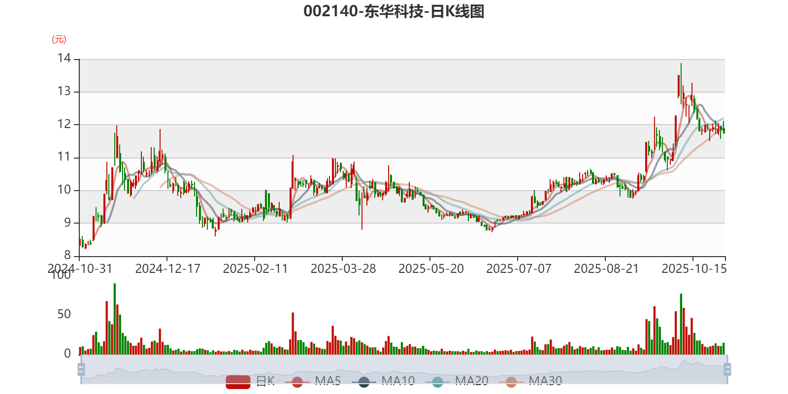 中证智能财讯东华科技(002140)10月31日披露2025年第三季度报告。前三季度公司实现营业总收入67.95亿元,同比增长5.61%;归母净利润3.65亿元,同比增长14.97%;扣非净利润2.5亿元,同比下降12.22%;经营活动产生的现金流量净额为5.13亿元,同比下降12.20%;报告期内,东华科技基本每股收益为0.5157元,加权平均净资产收益率为8.10%。公司2025年前三季度分配预案为:拟向全体股东每10股派现0.5元(含税)。