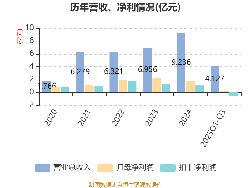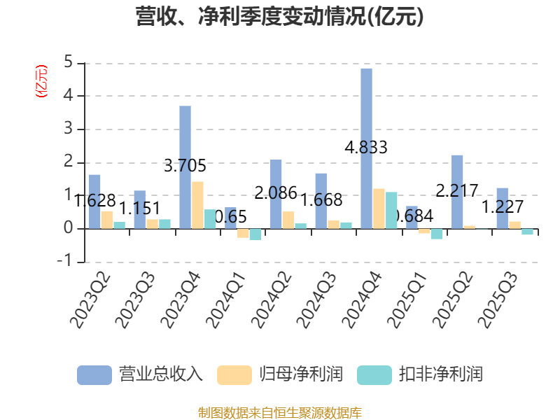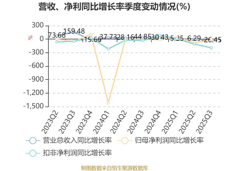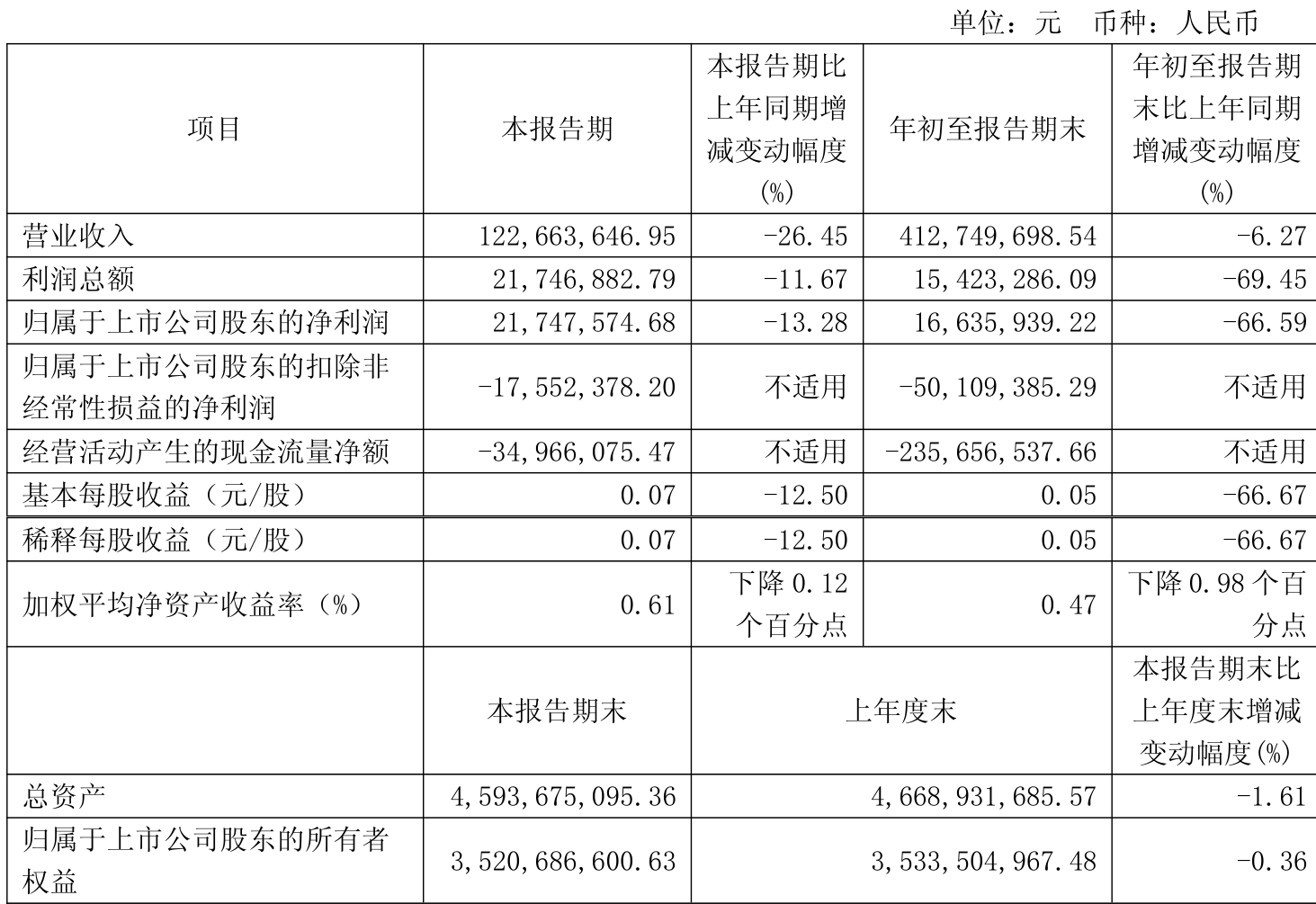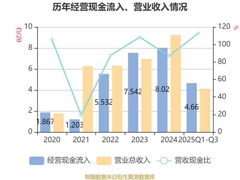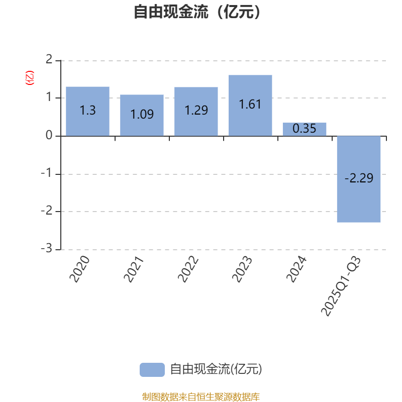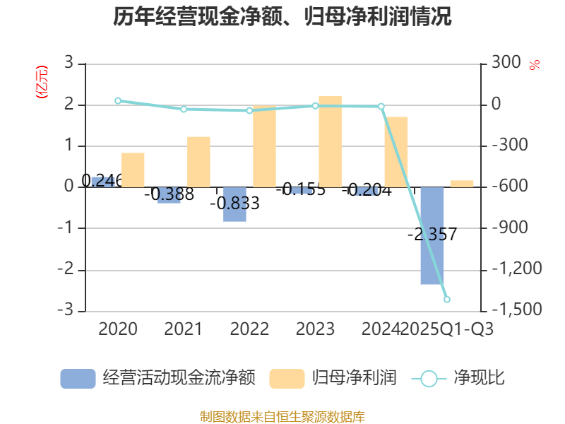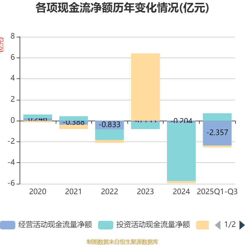 2025年前三季度,公司经营活动现金流净额为-2.36亿元,同比减少7712.95万元;筹资活动现金流净额-1884.4万元,同比增加378.1万元;投资活动现金流净额7133.82万元,上年同期为728.22万元。