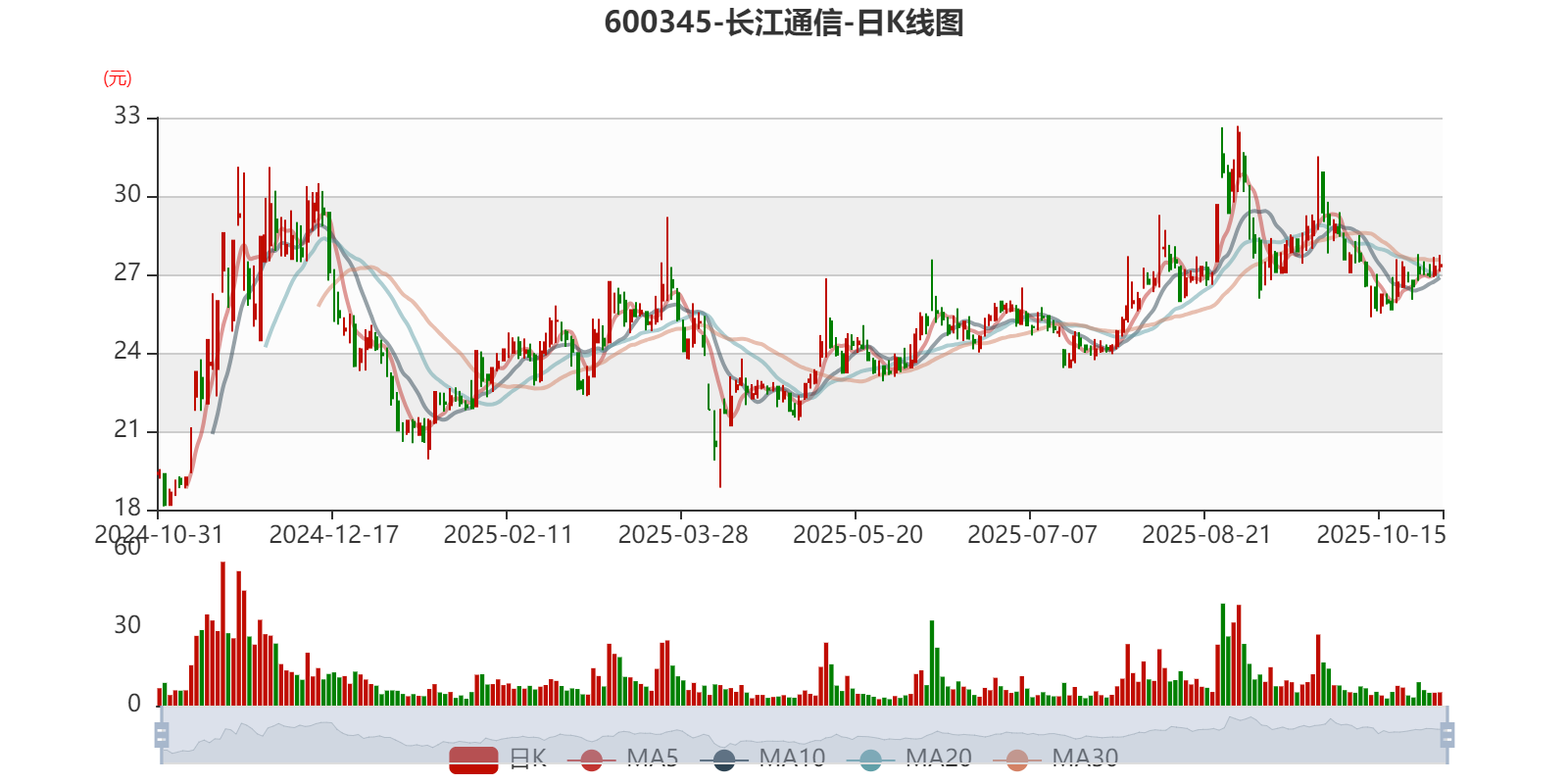 中证智能财讯长江通信(600345)10月31日披露2025年第三季度报告。前三季度公司实现营业总收入4.13亿元,同比下降6.27%;归母净利润1663.59万元,同比下降66.59%;扣非净利润亏损5010.94万元,上年同期盈利86.13万元;经营活动产生的现金流量净额为-2.36亿元,上年同期为-1.59亿元;报告期内,长江通信基本每股收益为0.05元,加权平均净资产收益率为0.47%。