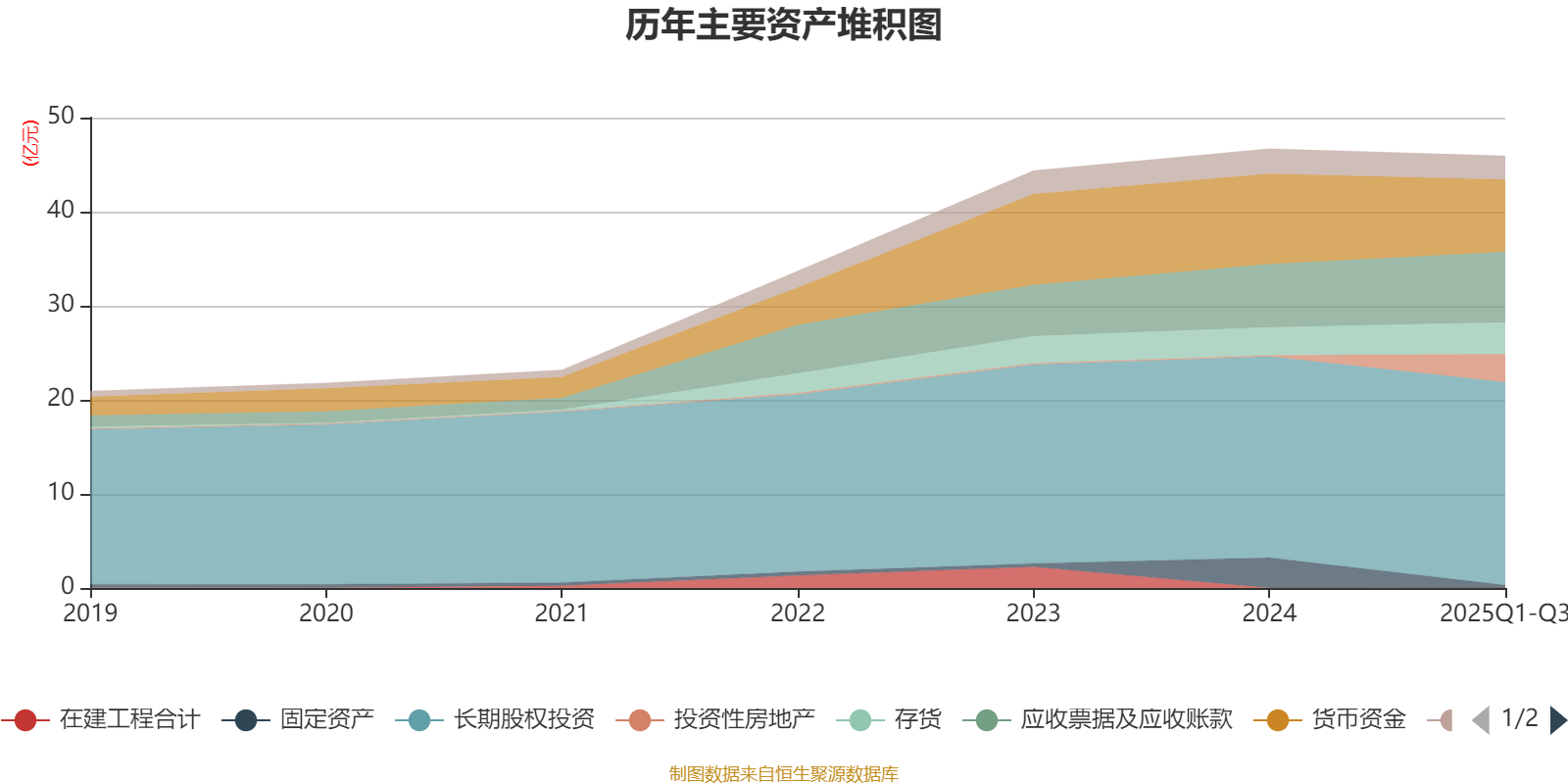 资产重大变化方面,截至2025年三季度末,公司固定资产较上年末减少90.74%,占公司总资产比重下降6.26个百分点;投资性房地产较上年末增加2064.84%,占公司总资产比重上升6.18个百分点;货币资金较上年末减少20.02%,占公司总资产比重下降3.84个百分点;应收票据及应收账款较上年末增加11.53%,占公司总资产比重上升1.93个百分点。