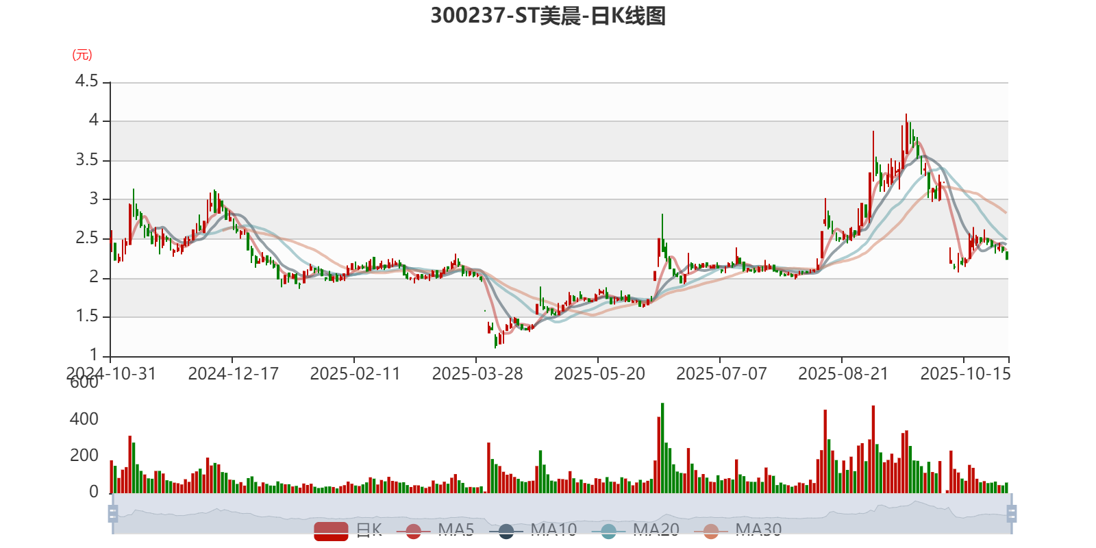 以10月30日收盘价计算,ST美晨目前市盈率(TTM)约为-11.48倍,市净率(LF)约-18.5倍,市销率(TTM)约1.76倍。