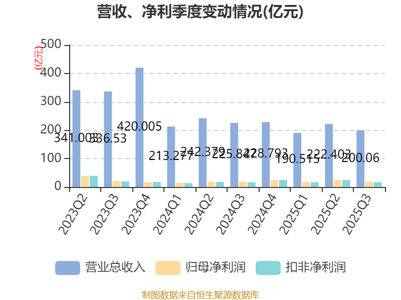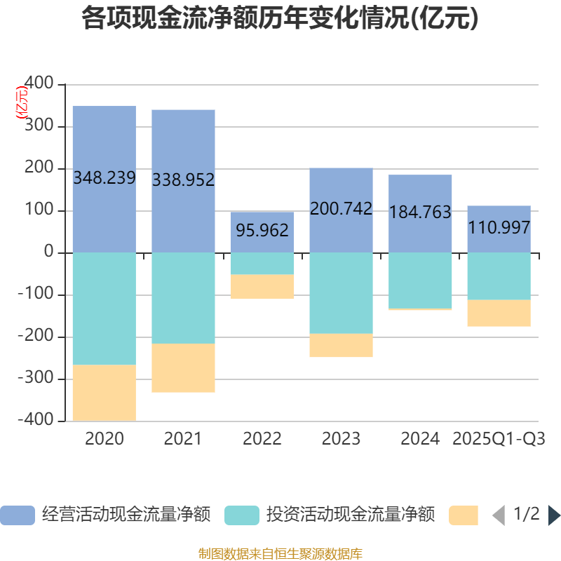 2025年前三季度,公司经营活动现金流净额为111亿元,同比增长7.27%;筹资活动现金流净额-63.06亿元,同比减少91.16亿元;投资活动现金流净额-112.9亿元,上年同期为-67.67亿元。