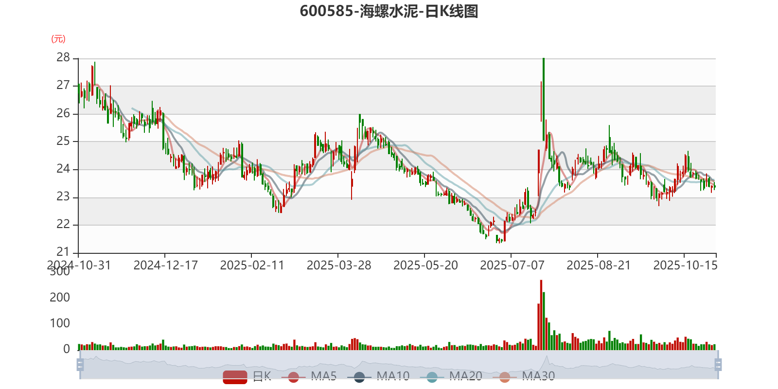 中证智能财讯海螺水泥(600585)10月31日披露2025年第三季度报告。前三季度公司实现营业总收入612.98亿元,同比下降10.06%;归母净利润63.05亿元,同比增长21.28%;扣非净利润59.37亿元,同比增长21.69%;经营活动产生的现金流量净额为111亿元,同比增长7.27%;报告期内,海螺水泥基本每股收益为1.19元,加权平均净资产收益率为3.33%。