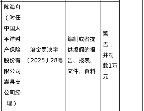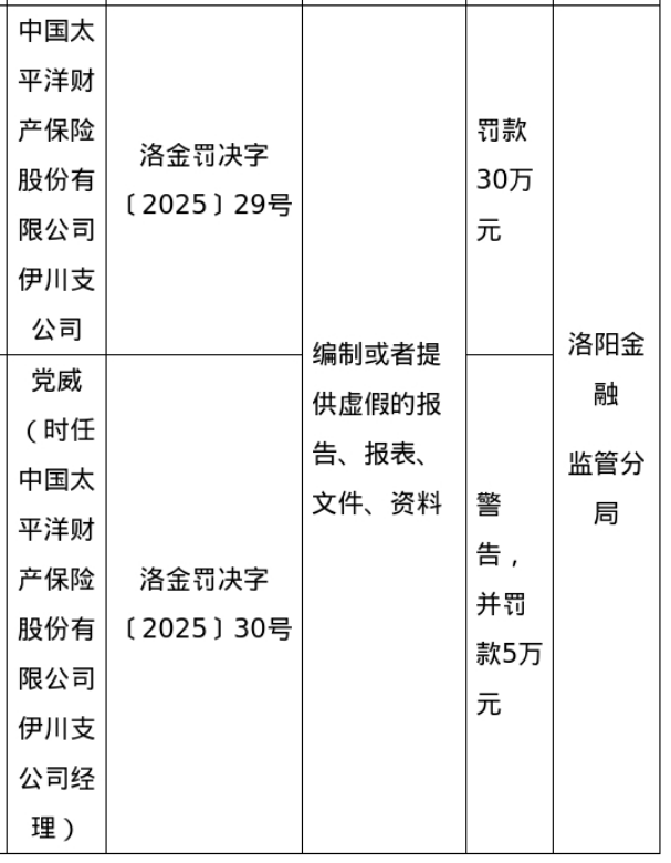 另外,中国太平洋财产保险股份有限公司伊川支公司因编制或者提供虚假的报告、报表、文件、资料,被罚款30万元。时任该支公司经理党威,被警告并罚款5万元。