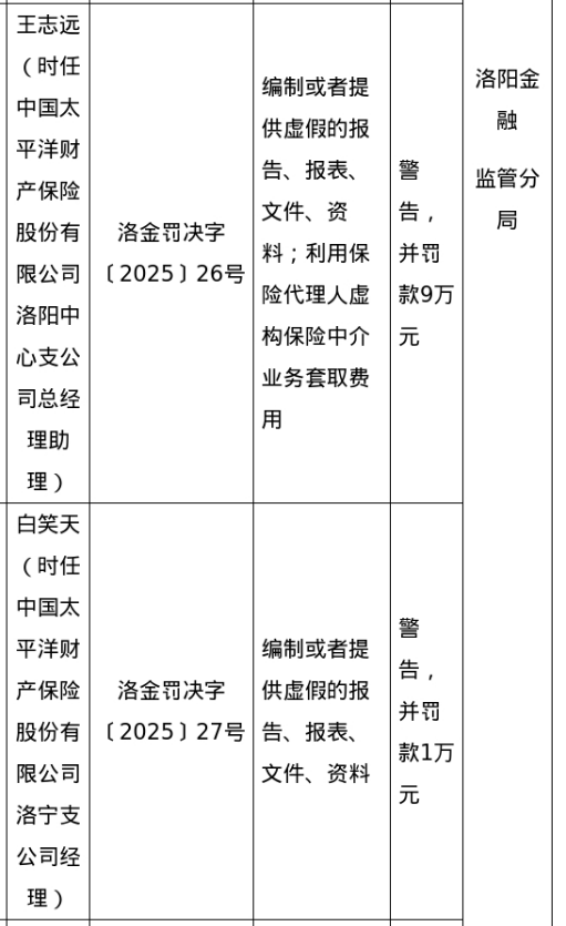 此外,时任中国太平洋财产保险股份有限公司洛阳中心支公司副总经理赵婕,被警告并罚款8万元;时任总经理助理王志远,被警告并罚款9万元;时任洛宁支公司经理白笑天,被警告并罚款1万元;时任嵩县支公司经理陈海舟,被警告并罚款1万元。