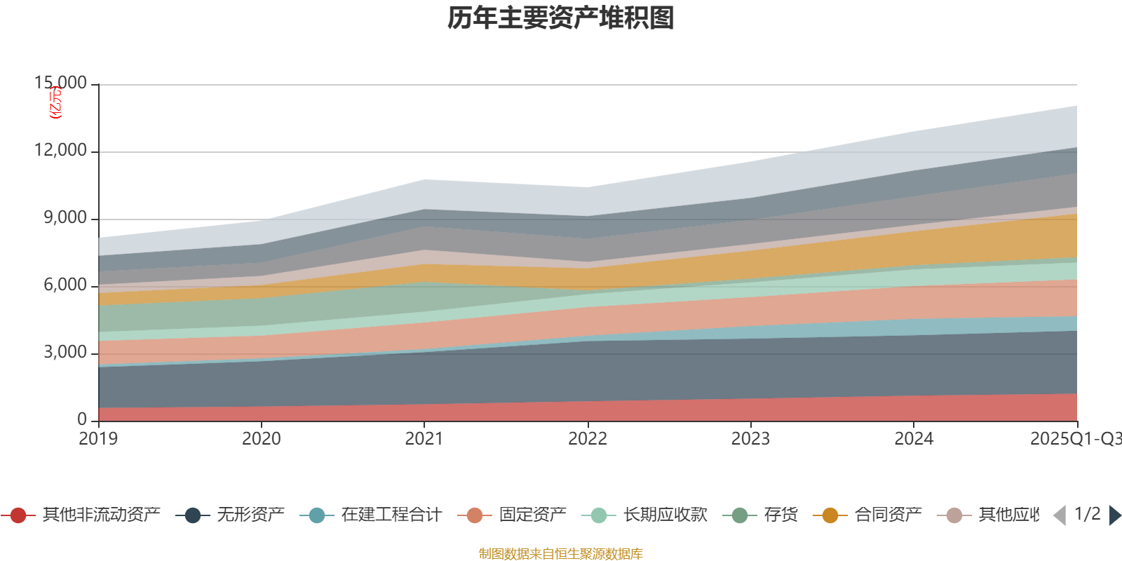 资产重大变化方面,截至2025年三季度末,公司合同资产较上年末增加28.15%,占公司总资产比重上升2.06个百分点;在建工程合计较上年末减少11.25%,占公司总资产比重下降1.06个百分点;无形资产较上年末增加4.12%,占公司总资产比重下降0.92个百分点;应收票据及应收账款较上年末增加17.58%,占公司总资产比重上升0.78个百分点。