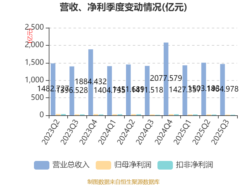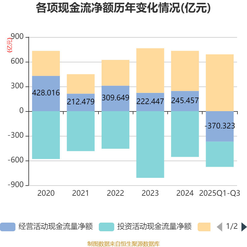 2025年前三季度,公司经营活动现金流净额为-370.32亿元,同比增加98.82亿元;筹资活动现金流净额690.21亿元,同比减少310.06亿元;投资活动现金流净额-306.59亿元,上年同期为-420.97亿元。