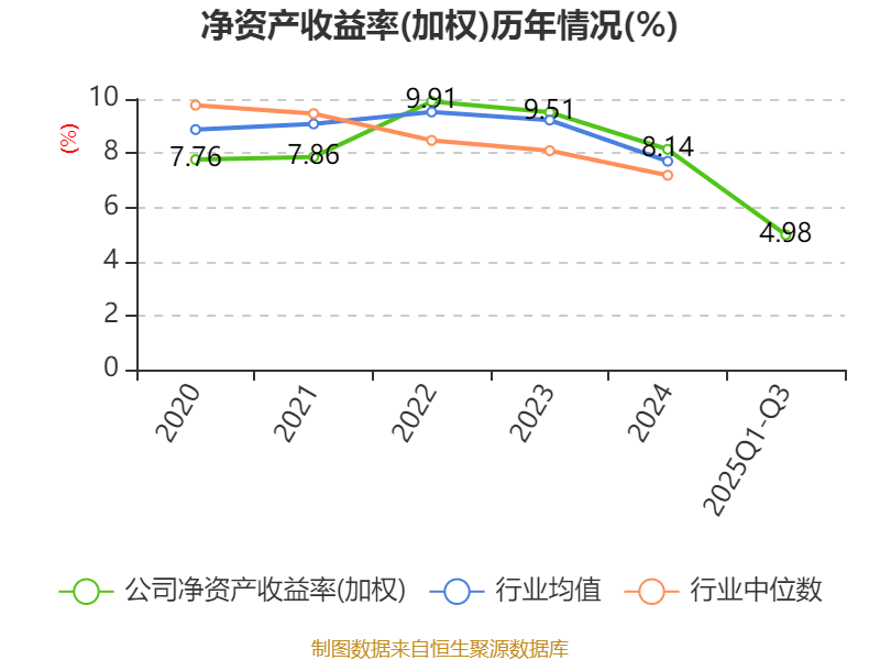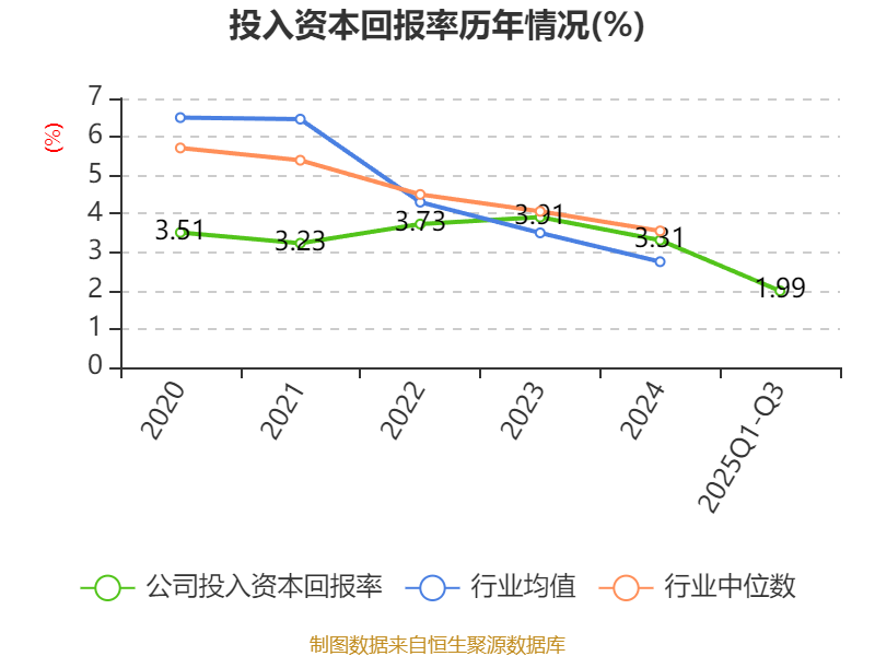 盈利能力方面, 2025年前三季度公司加权平均净资产收益率为4.98%,同比下降1.26个百分点。公司2025年前三季度投入资本回报率为1.99%,较上年同期下降0.46个百分点。