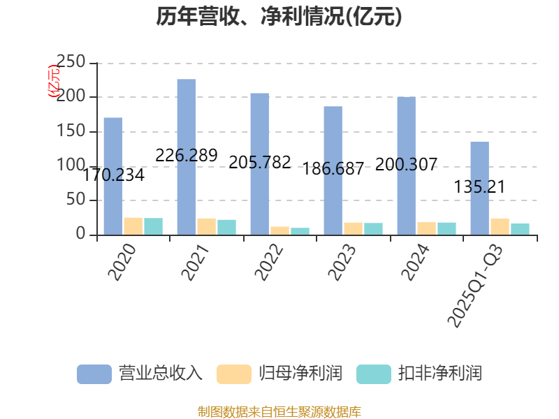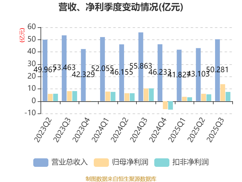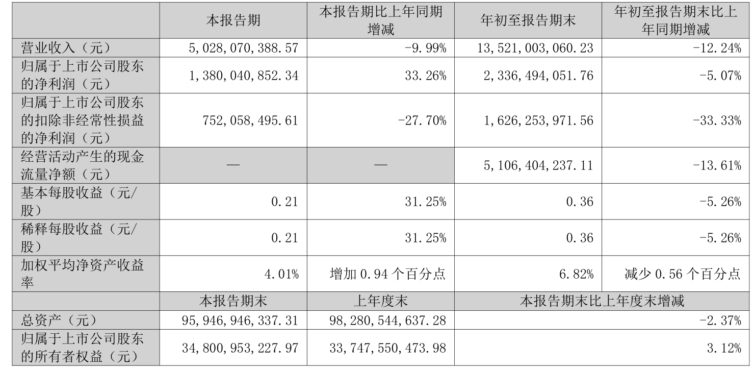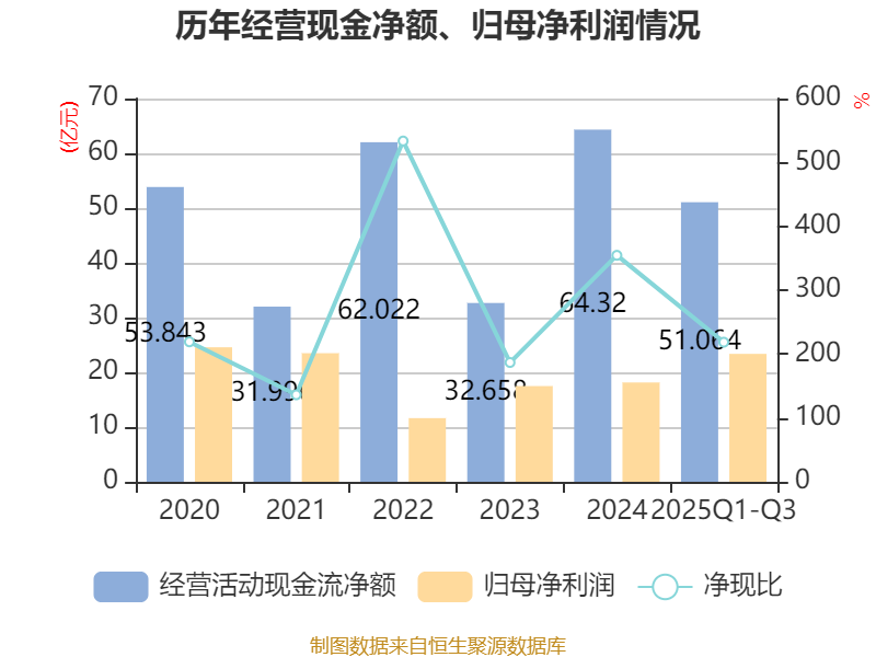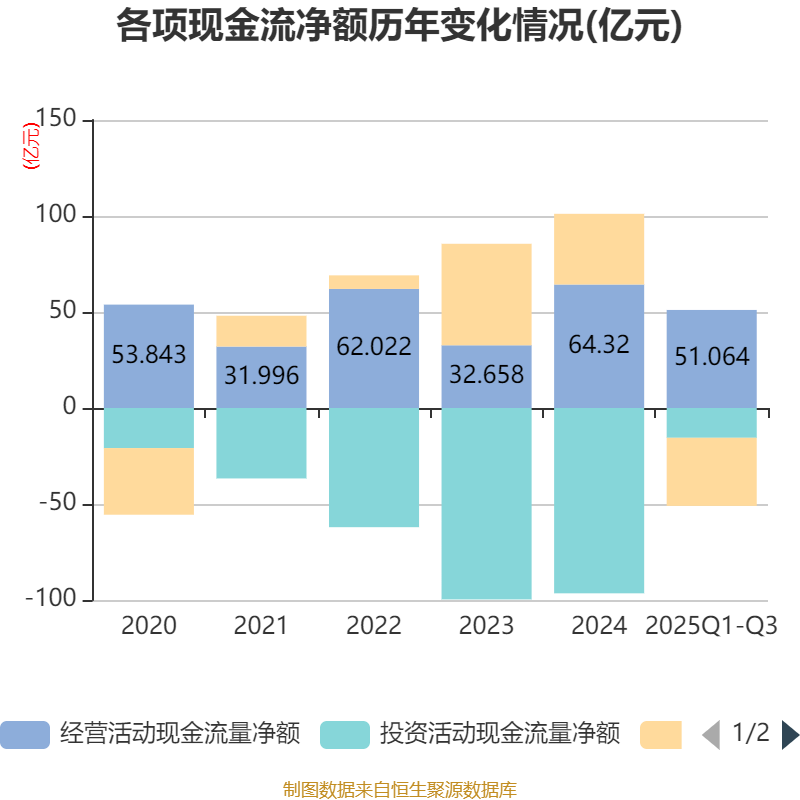 2025年前三季度,公司经营活动现金流净额为51.06亿元,同比下降13.61%;筹资活动现金流净额-35.48亿元,同比减少38.94亿元;投资活动现金流净额-15.51亿元,上年同期为-52.87亿元。