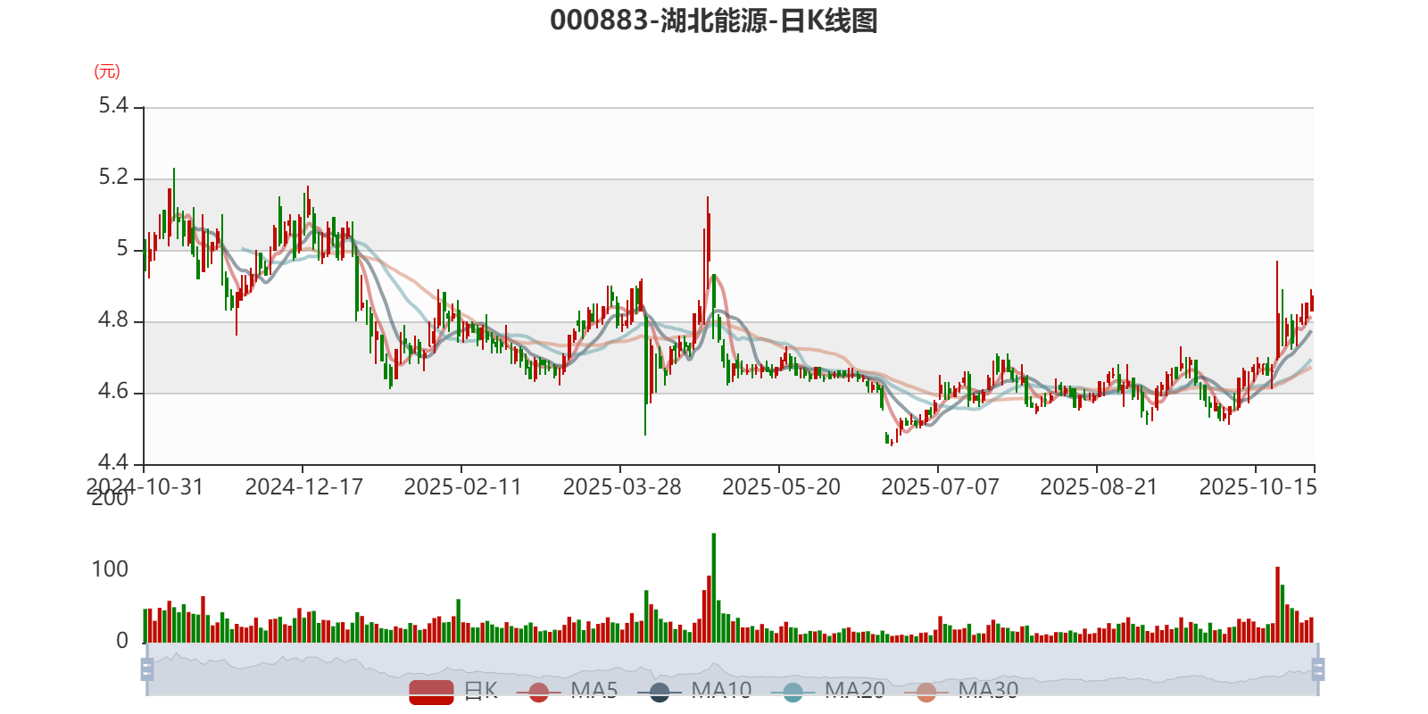 中证智能财讯湖北能源(000883)10月31日披露2025年第三季度报告。前三季度公司实现营业总收入135.21亿元,同比下降12.24%;归母净利润23.36亿元,同比下降5.07%;扣非净利润16.26亿元,同比下降33.33%;经营活动产生的现金流量净额为51.06亿元,同比下降13.61;报告期内,湖北能源基本每股收益为0.36元,加权平均净资产收益率为6.82%。
