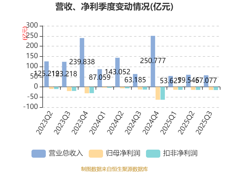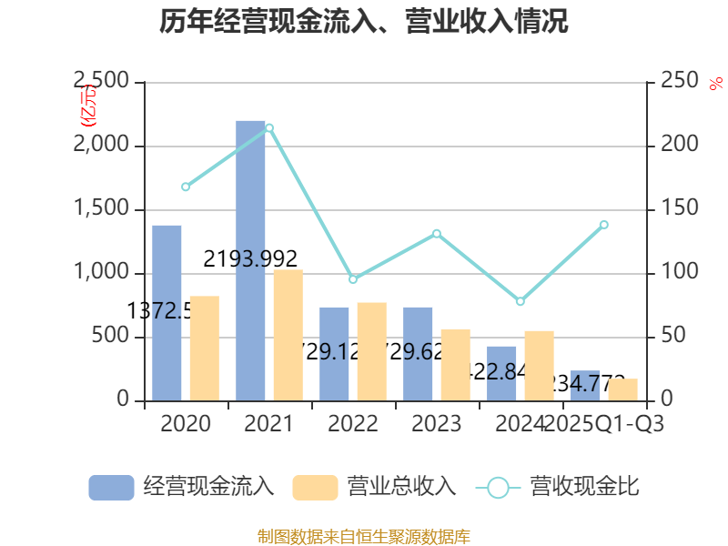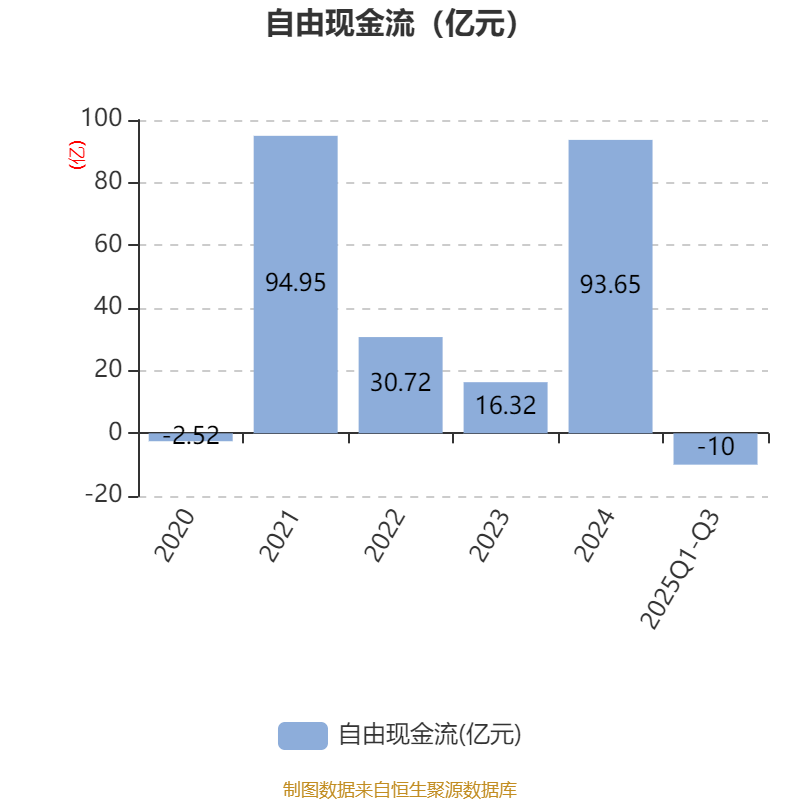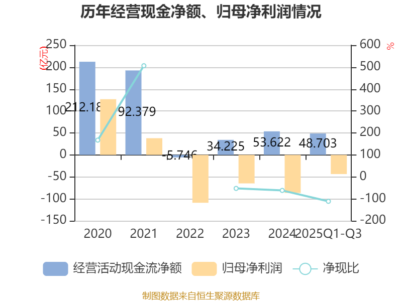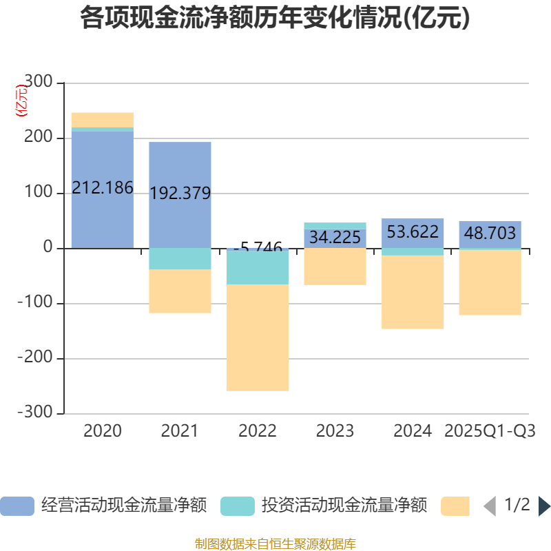 2025年前三季度,公司经营活动现金流净额为48.7亿元,同比增长192.1%;筹资活动现金流净额-118.38亿元,同比减少31.52亿元;投资活动现金流净额-3.58亿元,上年同期为-17.12亿元。