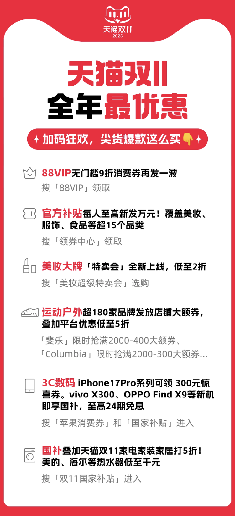 今天24点,新发权益应领尽领,全年最优惠的天猫“双11”现货开卖至11月14日24点。