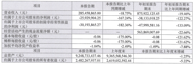 中证智能财讯宏川智慧(002930)10月31日披露2025年第三季度报告。前三季度公司实现营业总收入8.76亿元,同比下降19.46%;归母净利润亏损3813.3万元,上年同期盈利1.71亿元;扣非净利润亏损4799.96万元,上年同期盈利1.45亿元;经营活动产生的现金流量净额为5.64亿元,同比下降22.66%;报告期内,宏川智慧基本每股收益为-0.08元,加权平均净资产收益率为-1.49%。