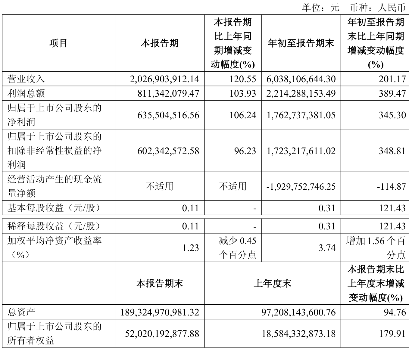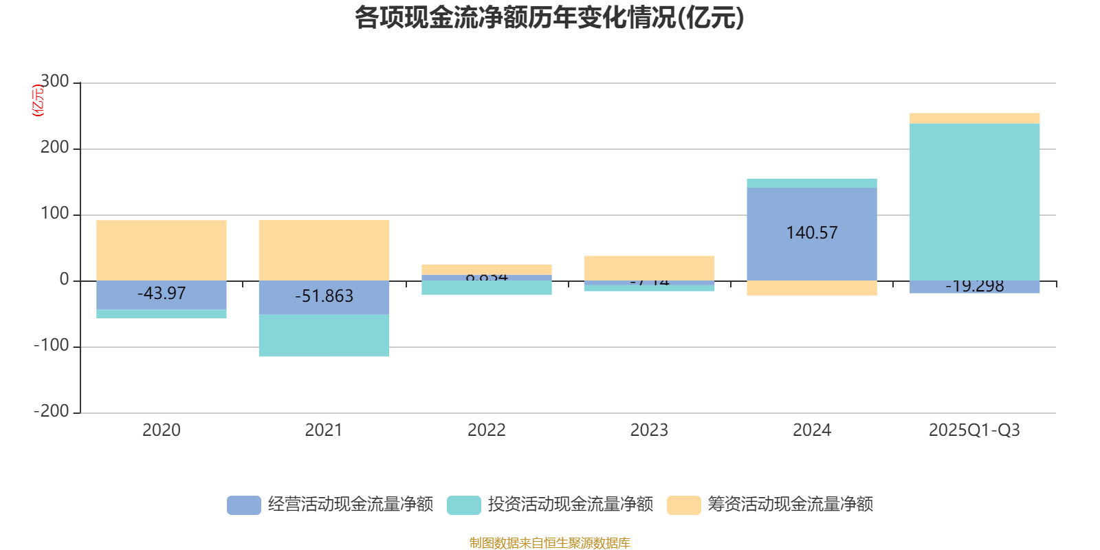 2025年前三季度,公司经营活动现金流净额为-19.3亿元,同比减少149.07亿元;筹资活动现金流净额15.54亿元,同比增加27.63亿元;投资活动现金流净额238.13亿元,上年同期为21.84亿元。