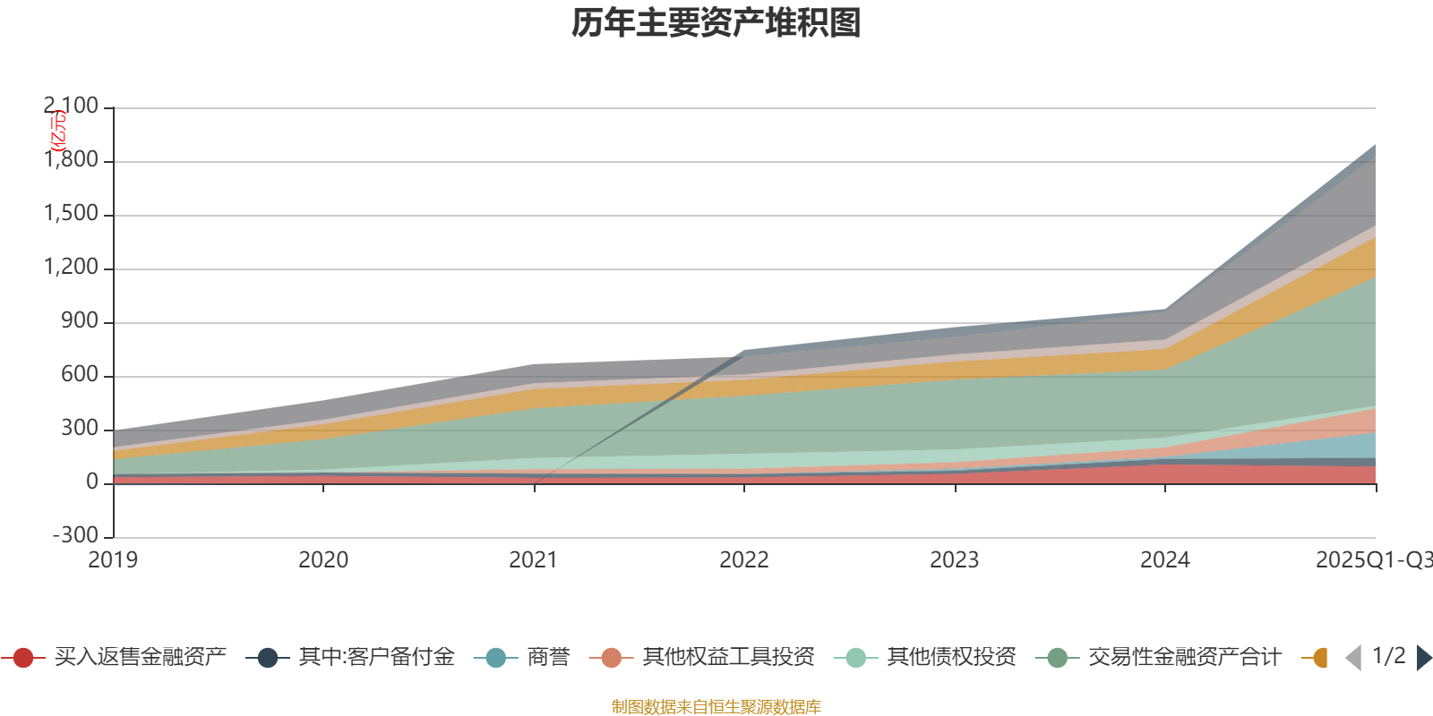 资产重大变化方面,截至2025年三季度末,公司商誉较上年末增加1131.59%,占公司总资产比重上升6.26个百分点;买入返售金融资产较上年末减少10.14%,占公司总资产比重下降5.8个百分点;其他债权投资较上年末减少72.98%,占公司总资产比重下降4.93个百分点;货币资金较上年末增加150.41%,占公司总资产比重上升4.53个百分点。