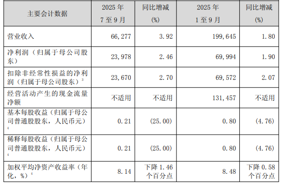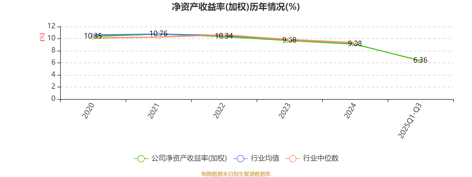盈利能力方面, 2025年前三季度公司加权平均净资产收益率为6.36%,同比下降0.44个百分点。