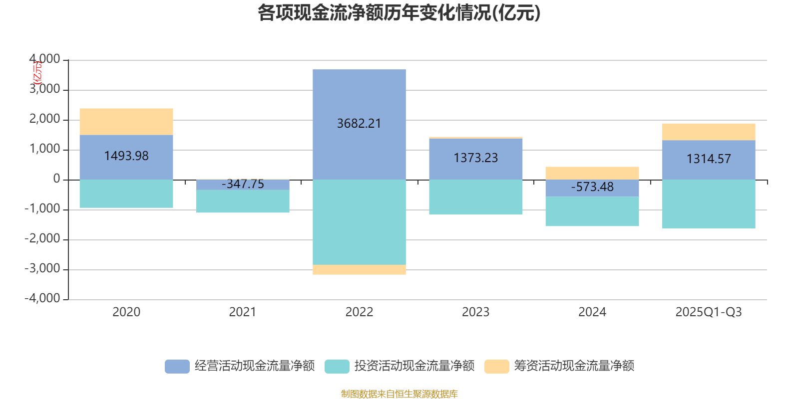 2025年前三季度,公司经营活动现金流净额为1314.57亿元,同比增加2471.18亿元;筹资活动现金流净额556.31亿元,同比增加532.18亿元;投资活动现金流净额-1632.92亿元,上年同期为-11.54亿元。