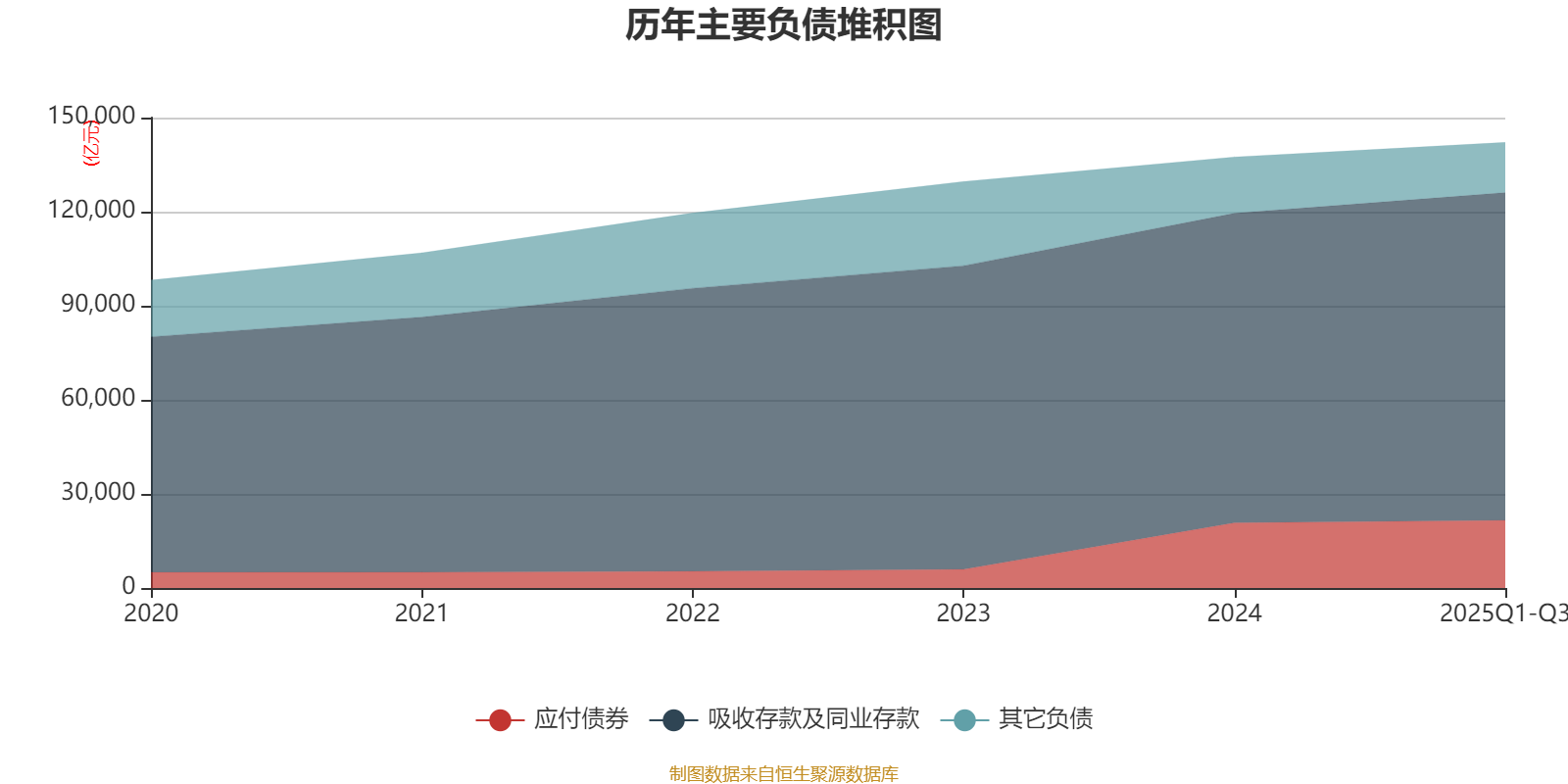 负债重大变化方面,截至2025年三季度末,公司吸收存款及同业存款较上年末增加5.82%,占公司总资产比重上升1.15个百分点;卖出回购金融资产款较上年末减少16.72%,占公司总资产比重下降0.75个百分点;衍生金融负债较上年末减少57.3%,占公司总资产比重下降0.34个百分点;拆入资金较上年末减少2.68%,占公司总资产比重下降0.23个百分点。