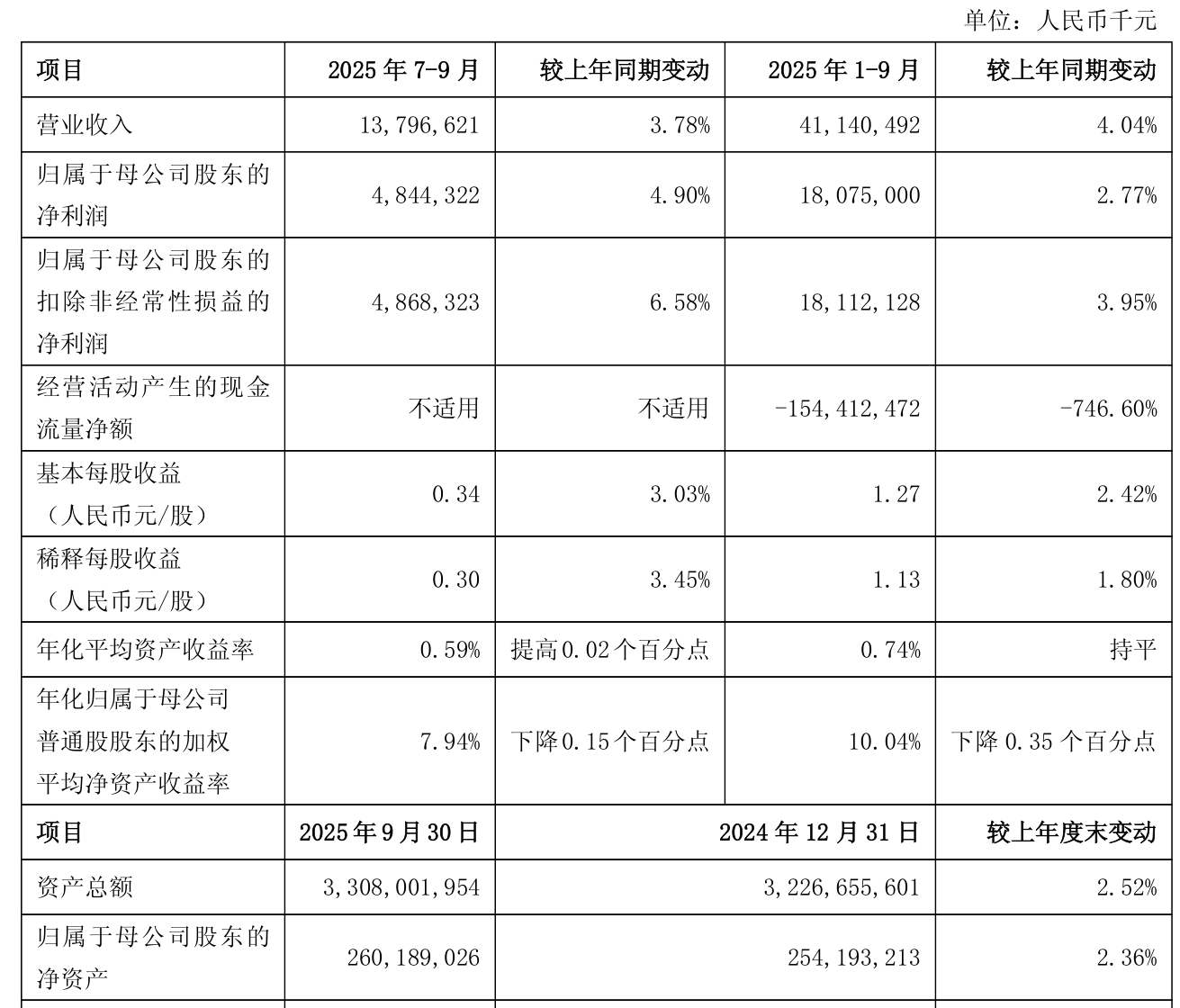 负债重大变化方面,截至2025年三季度末,公司应付债券较上年末增加29.81%,占公司总资产比重上升3.82个百分点;吸收存款及同业存款较上年末减少0.58%,占公司总资产比重下降2.03个百分点;卖出回购金融资产款较上年末减少30.33%,占公司总资产比重下降1.79个百分点;向中央银行借款较上年末增加18.25%,占公司总资产比重上升0.46个百分点。