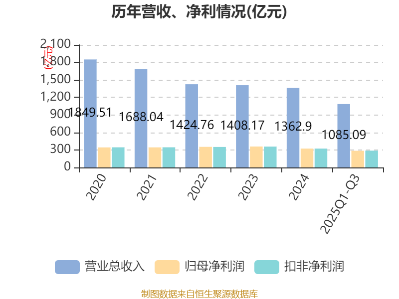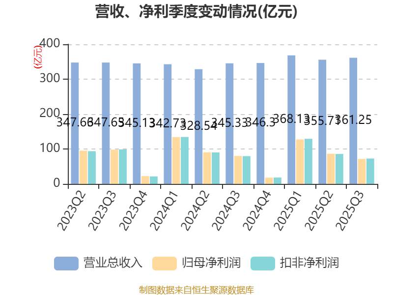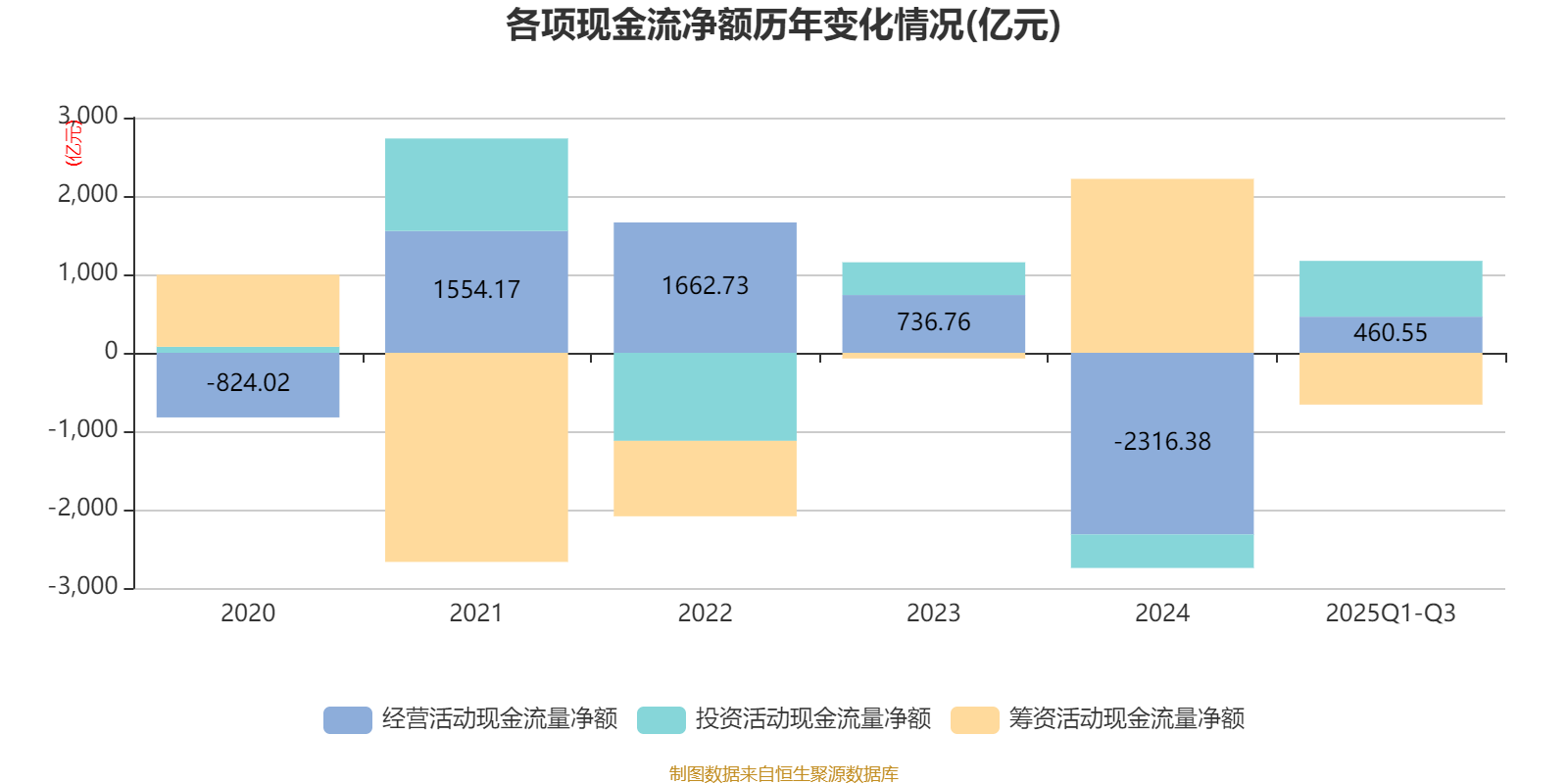 2025年前三季度,公司经营活动现金流净额为460.55亿元,同比增加2406.55亿元;筹资活动现金流净额-660.49亿元,同比减少2016.42亿元;投资活动现金流净额712亿元,上年同期为43.35亿元。