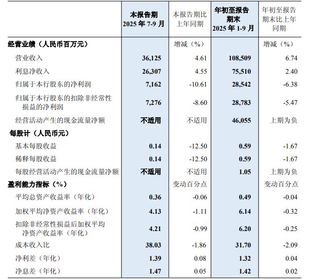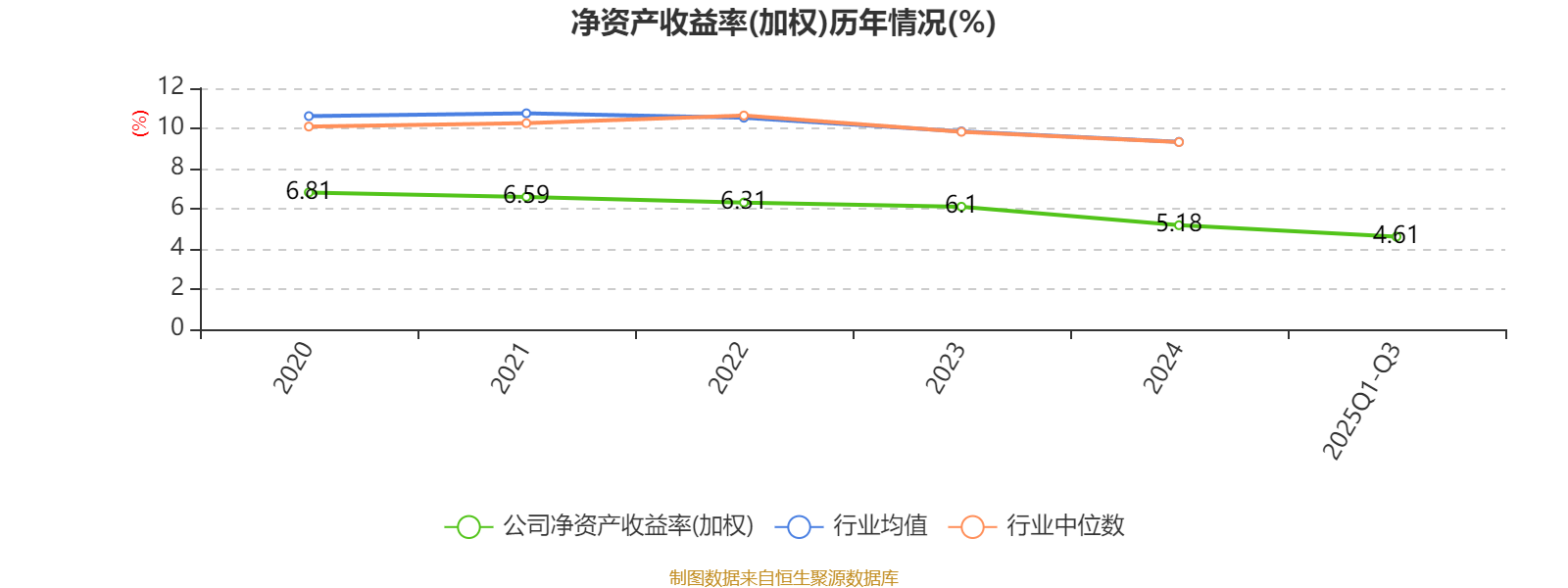 盈利能力方面, 2025年前三季度公司加权平均净资产收益率为4.61%,同比下降0.24个百分点。