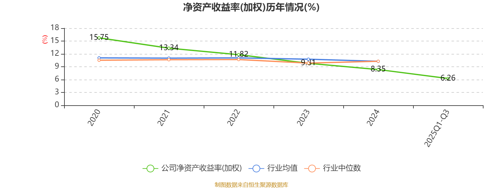 盈利能力方面, 2025年前三季度公司加权平均净资产收益率为6.26%,同比下降0.55个百分点。